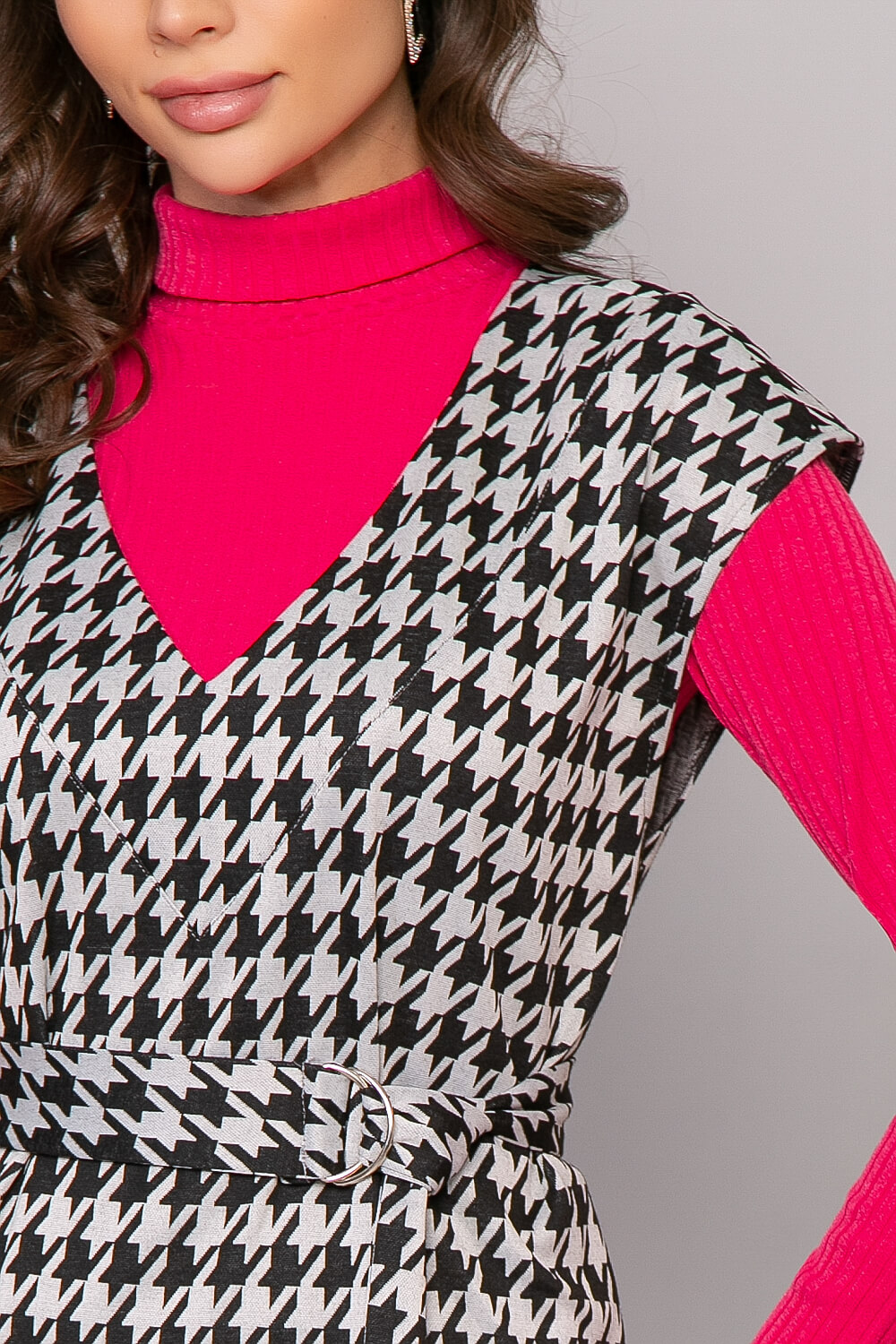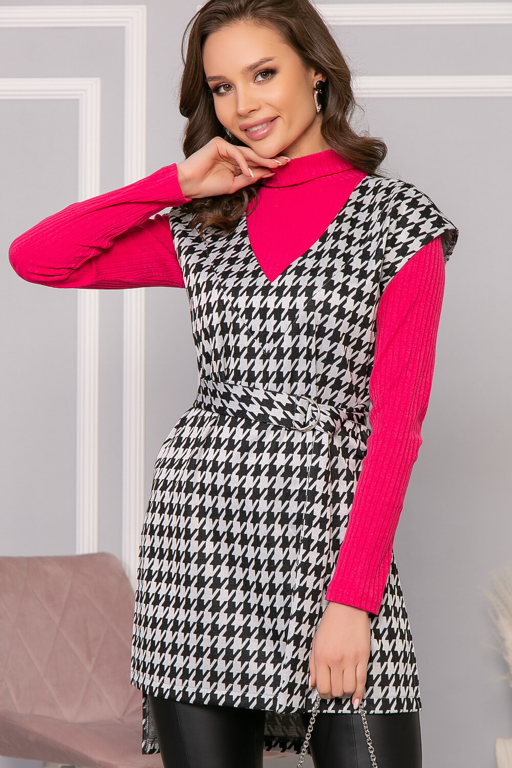 Удлинённый жилет с классическим принтом "Гусиная лапка" - абсолютно универсальная вещь. С ним можно надеть брюки любого кроя, джинсы, шорты, юбки и платья, водолазки, рубашки. С его помощью визуально вытягивается силуэт, придавая фигуре утонченность. В комплект входит пояс из основной ткани с металлической пряжкой-полукольцами. По бокам есть разрезы. Спинка удлинена.