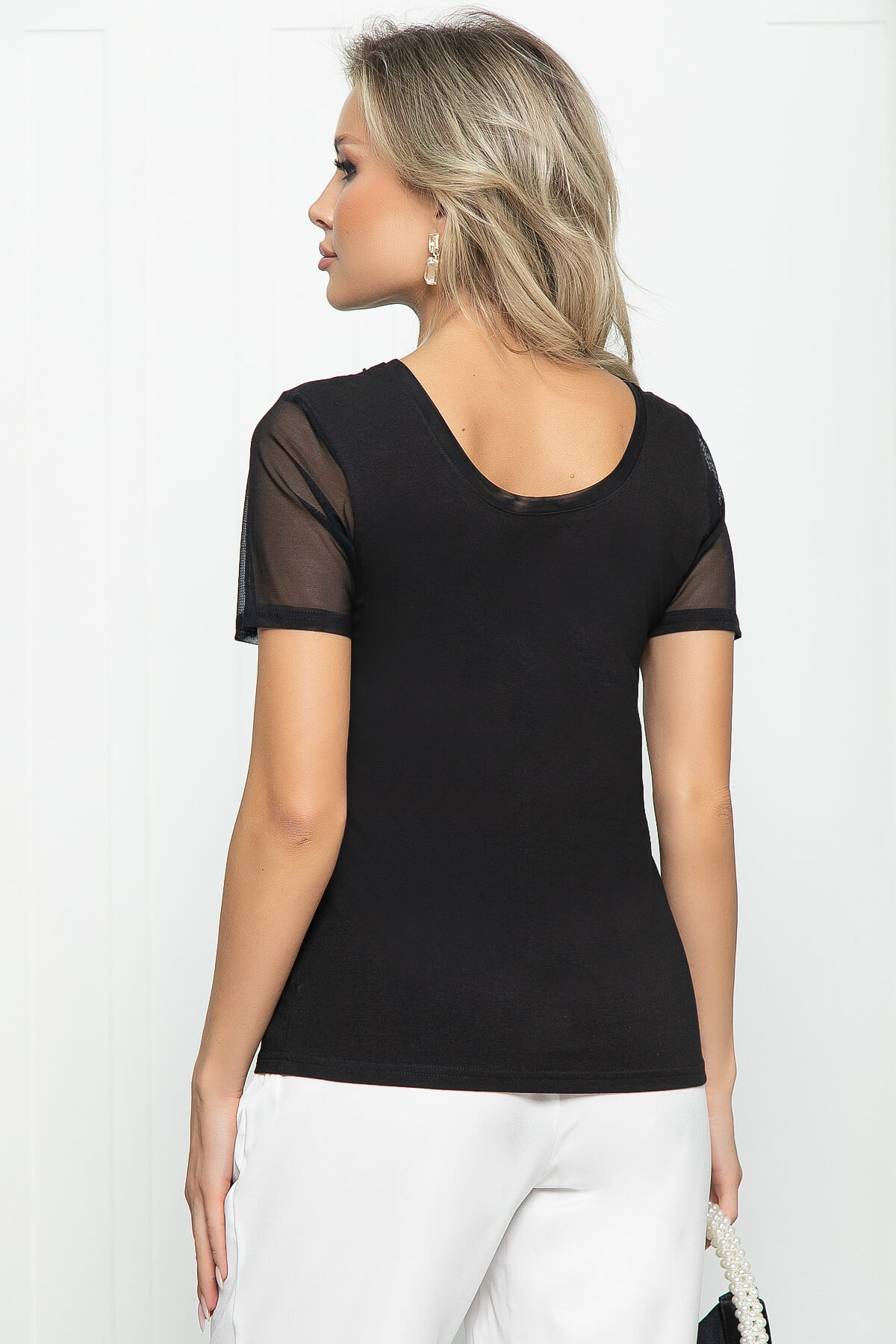Роскошная, а главное универсальная блуза придаст образу привлекательности. Изысканности образу придает вырез с акцентным декором, который подчеркивает зону декольте. Изделие можно носить наоборот - акцентным декором по спинке, тогда образ станет более скромным и элегантным. Рукав укороченный, втачной, выполнен из эластичной сетки.