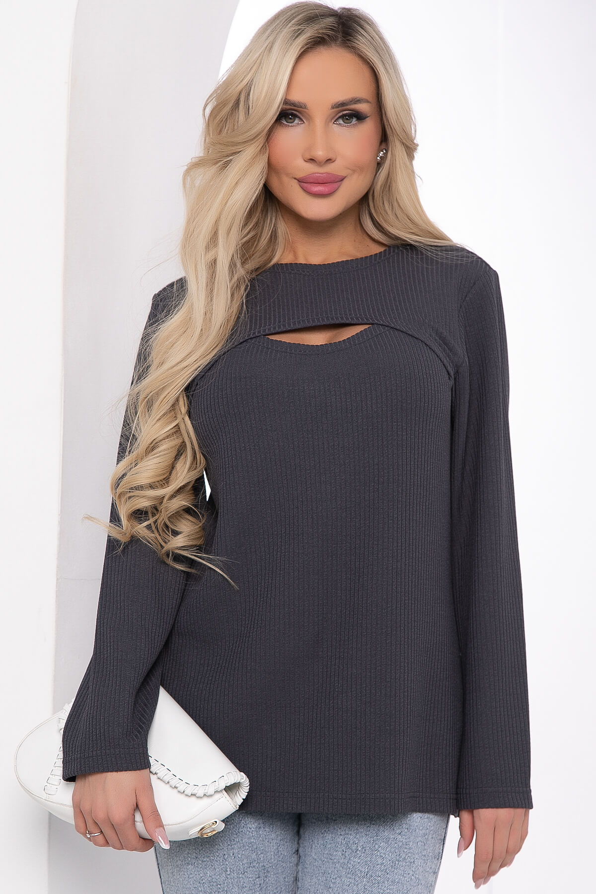 Оригинальный джемпер с деликатным фигурным вырезом выше груди. Привлекательный крой делает джемпер более женственным и соблазнительным. Рукава длинные, втачные. Джемпер с вырезом, это идеальный вариант для женщин, которые следят за модными тенденциями и любят быть в центре внимания.