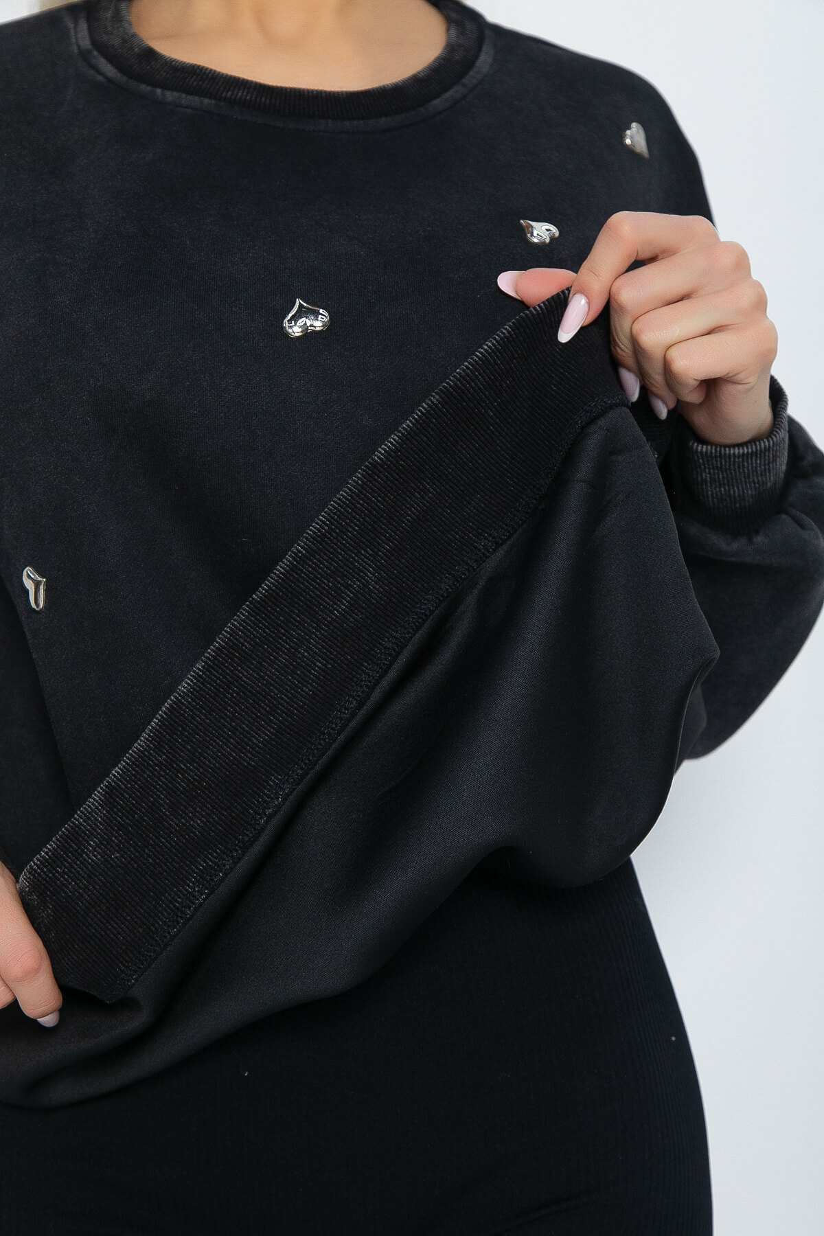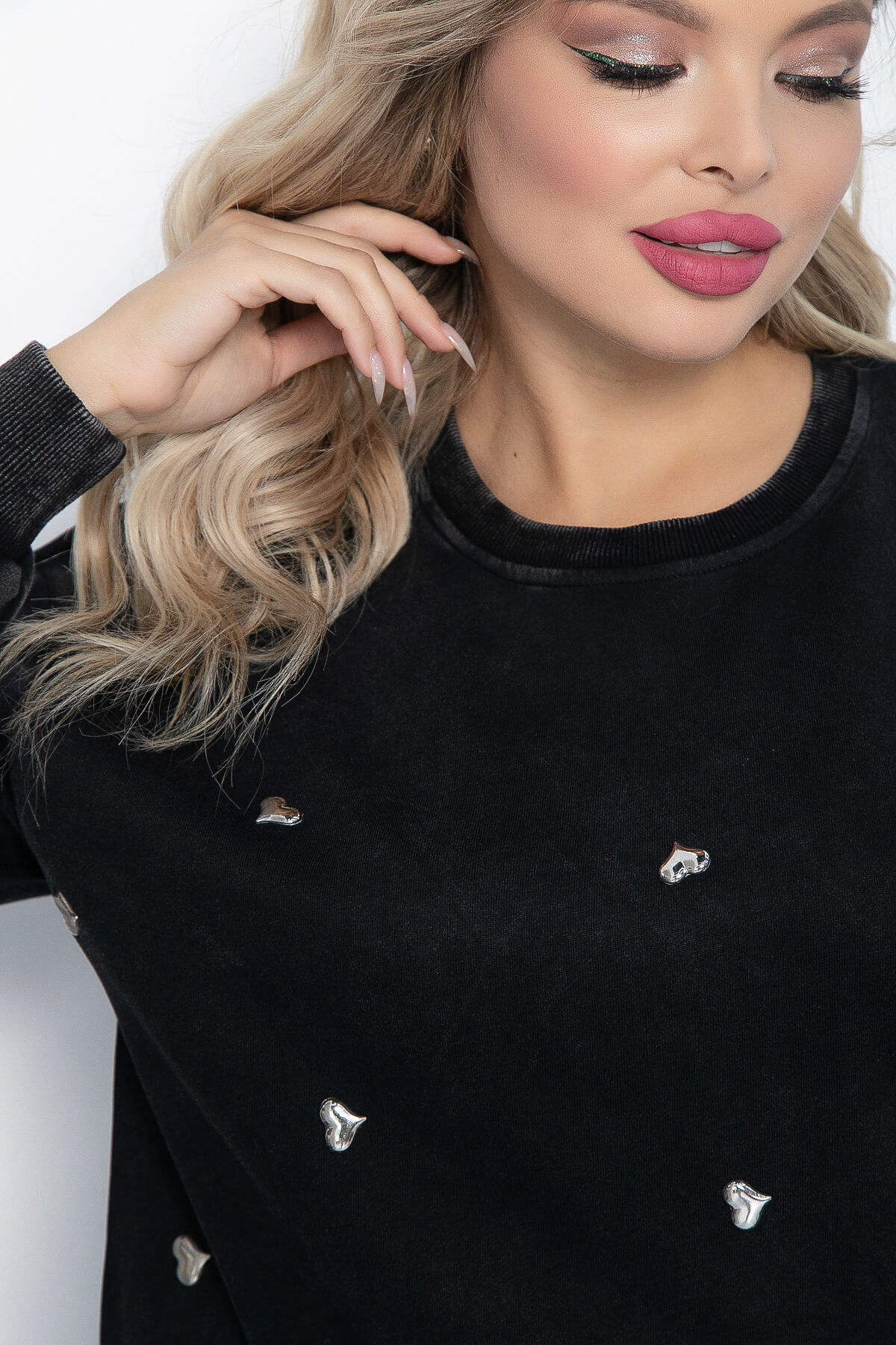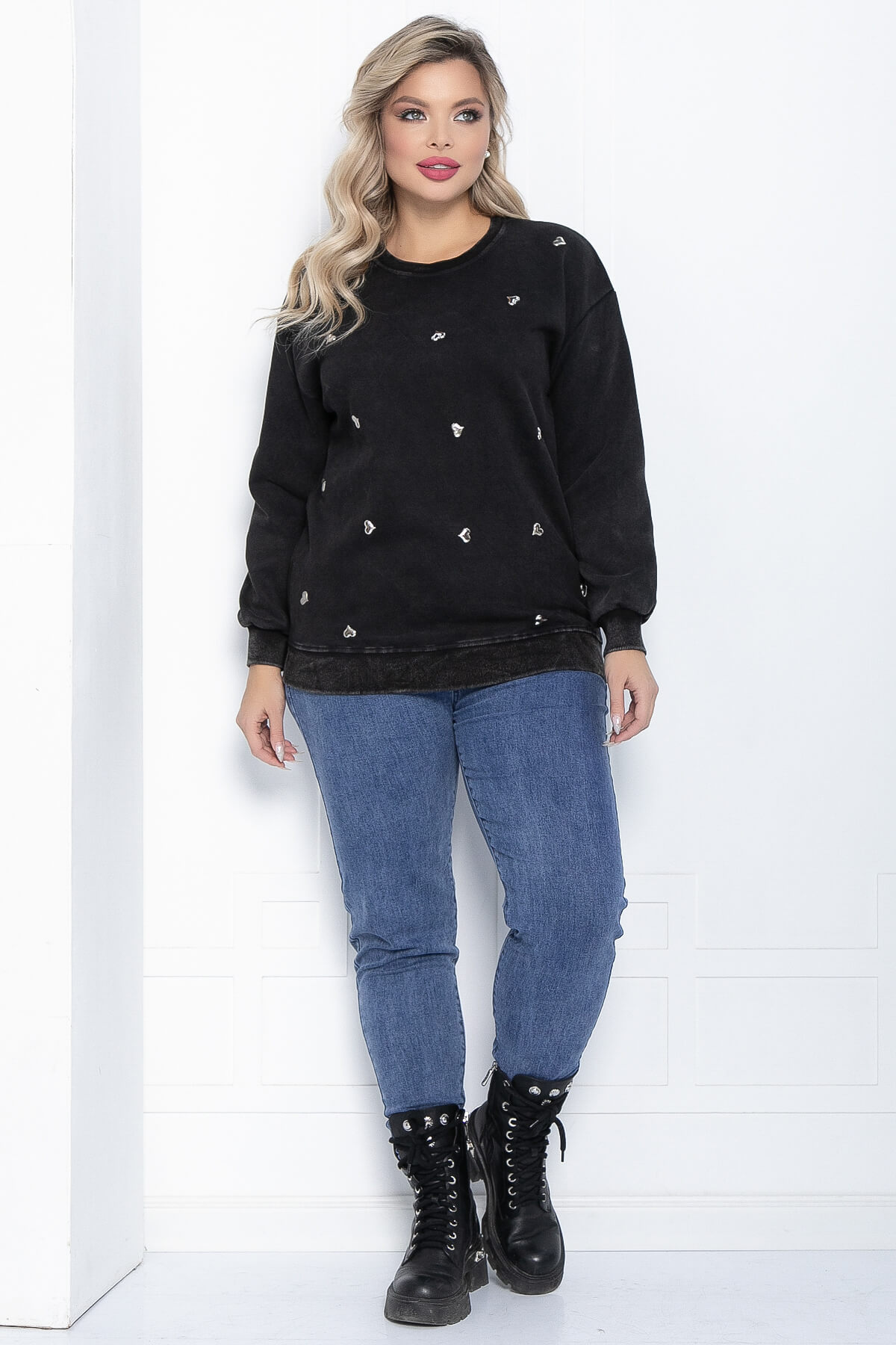 Джемпер в чёрном оттенке с эффектом «варёной» ткани обладает свободным кроем, что обеспечивает комфорт и свободу движений. Декоративные сердечки придают ему игривость и романтичность. Идеально сочетается с джинсами, леггинсами или юбками, позволяя создавать разнообразные образы как для прогулок по городу, так и для вечерних встреч с друзьями. В сочетании с кедами или уютными ботинками он станет основой лёгкого и стильного образа.
