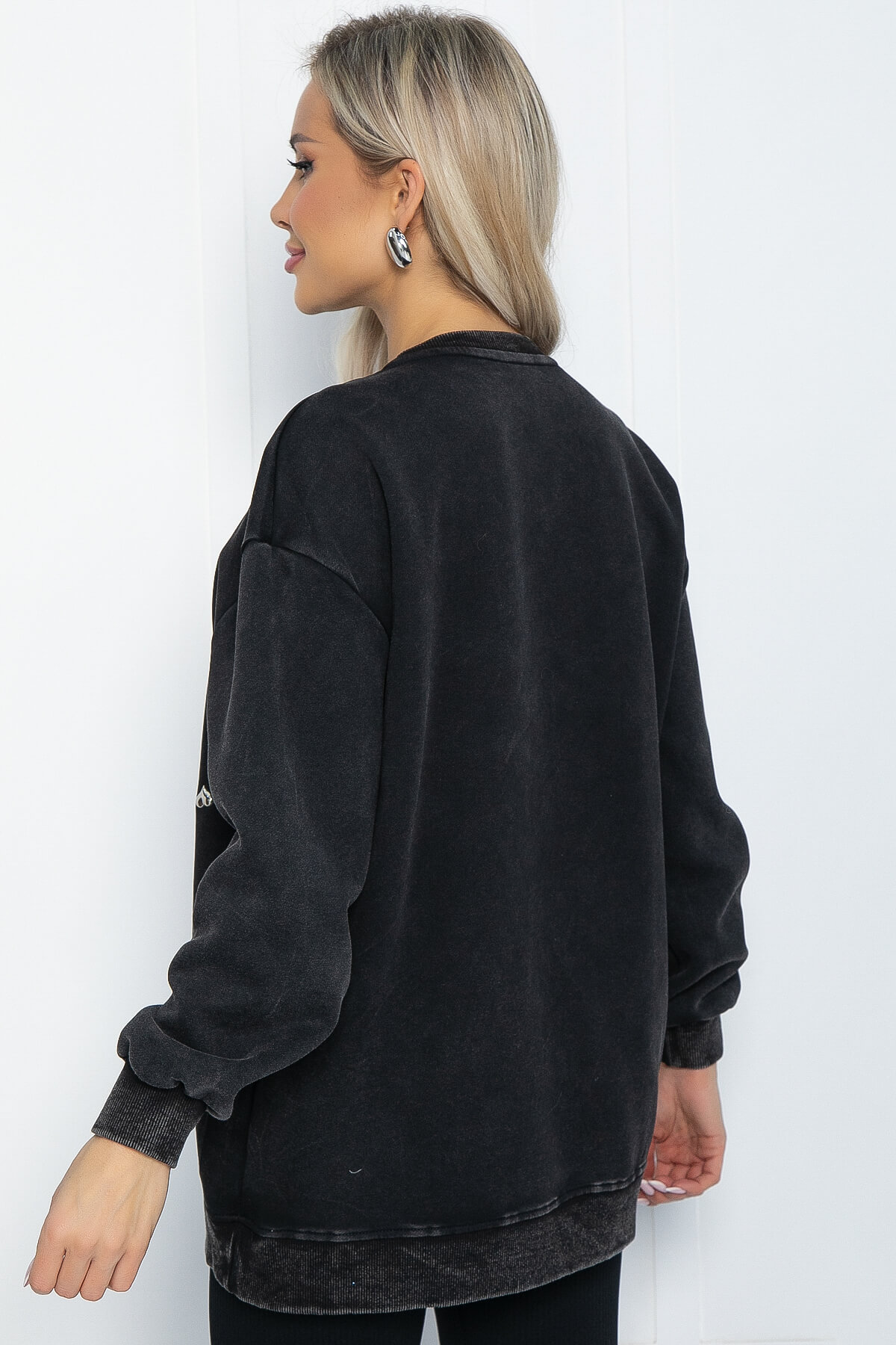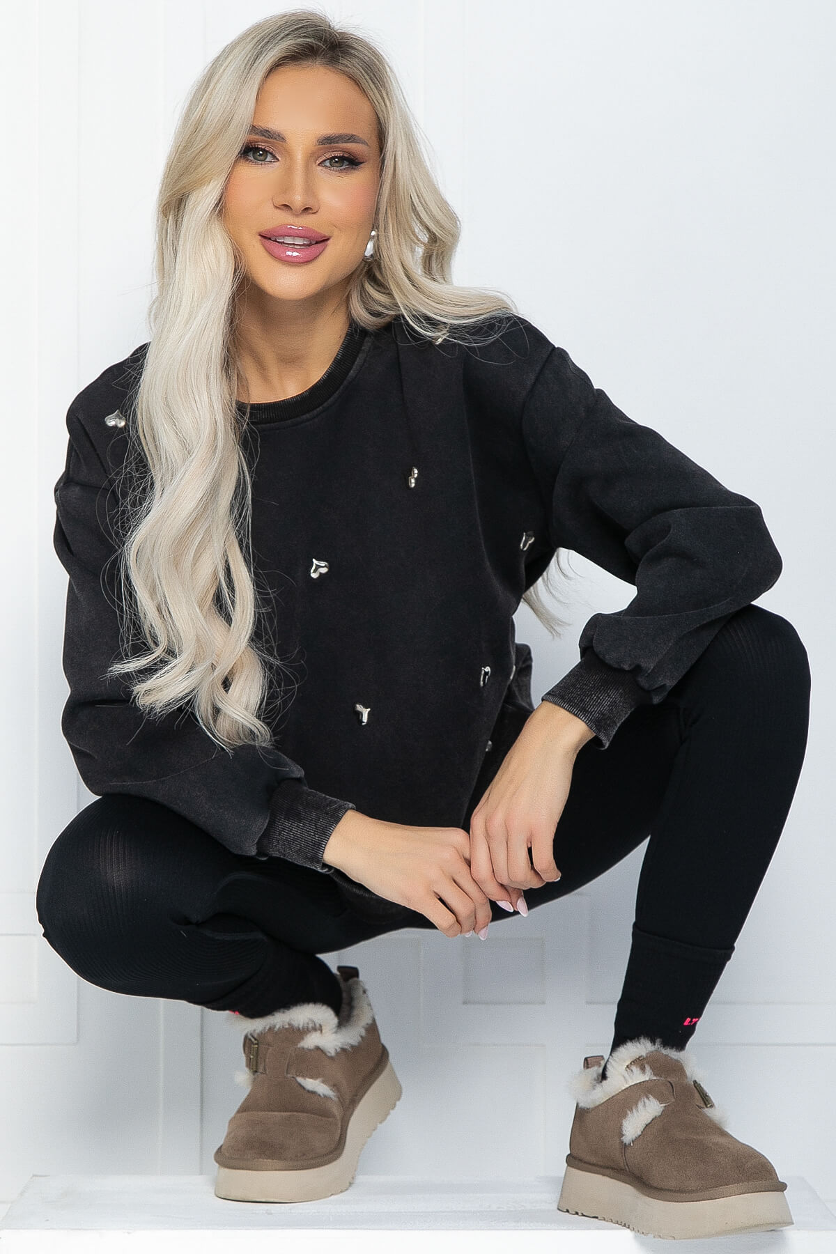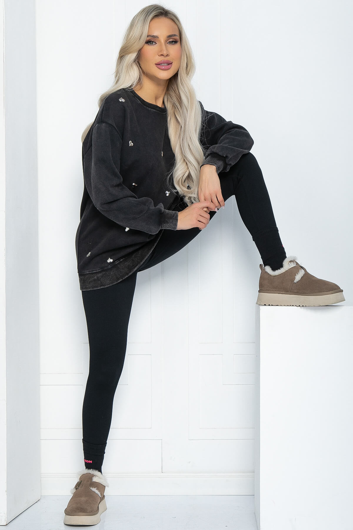 Джемпер в чёрном оттенке с эффектом «варёной» ткани обладает свободным кроем, что обеспечивает комфорт и свободу движений. Декоративные сердечки придают ему игривость и романтичность. Идеально сочетается с джинсами, леггинсами или юбками, позволяя создавать разнообразные образы как для прогулок по городу, так и для вечерних встреч с друзьями. В сочетании с кедами или уютными ботинками он станет основой лёгкого и стильного образа.