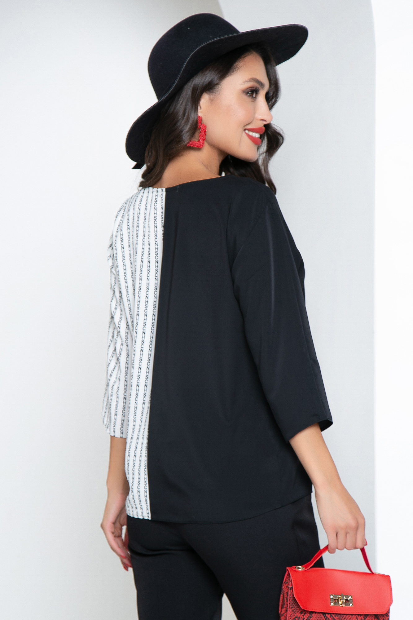 - Комбинированная блуза: одна часть выполнена из однотонной блузочной ткани чёрного цвета, вторая часть из ткани с дизайнерским принтом;