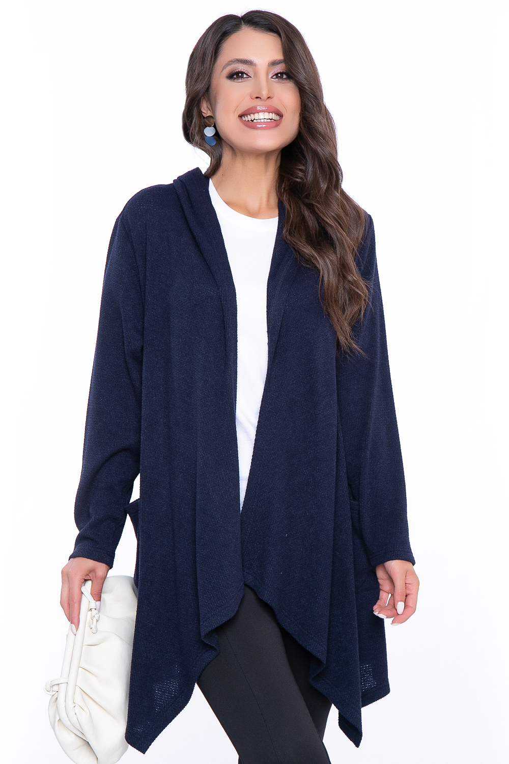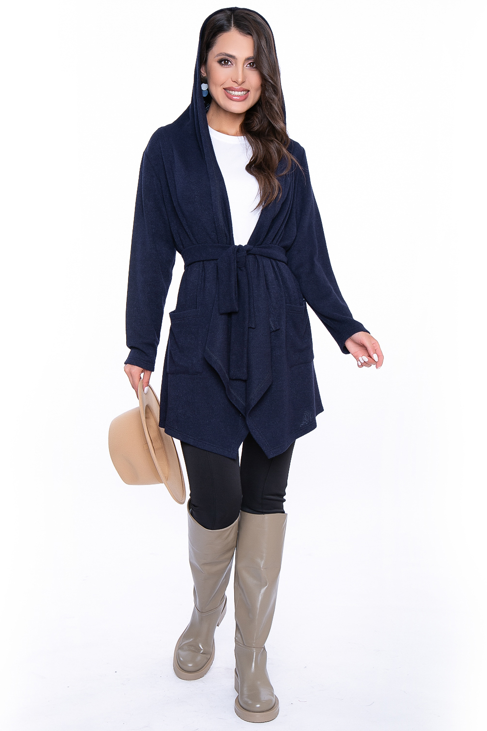 - Трикотажный кардиган с шалевым воротником-капюшоном;