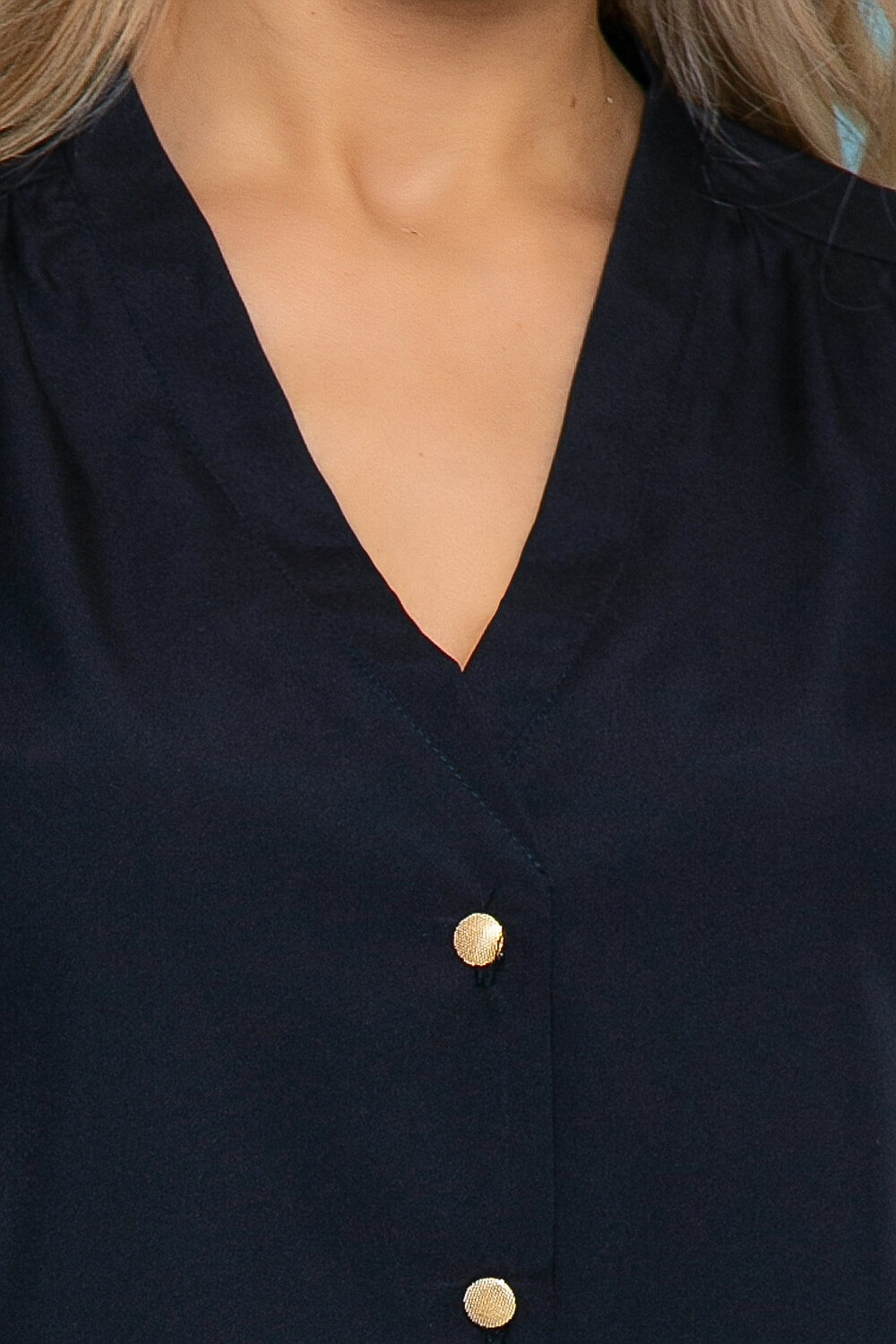 Пожалуй, самым основным базовым элементом в гардеробе является блуза! Она может стать отличной основой для создания самых разных стильных образов. Универсальная блуза прямого силуэта, выполнена из приятной к телу ткани, в красивом синем оттенке. V-образный вырез, формирующий стойку по спинке, подчеркивает зону декольте. Акцентные плечевые швы оформлены сборками. Рукав втачной. Застегивается по переду на пуговки золотого цвета. По спинке широкая кокетка со сборкой.