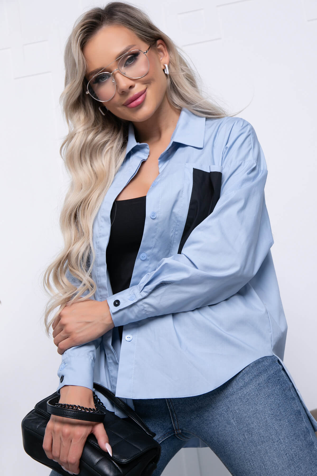 Рубашка, как базовая вещь, отлично дополнит любой образ: офисный, деловой или повседневный. Может стать частью многослойного образа или изюминкой комплекта с брюками или джинсами. Рубашка свободного кроя, по переду притачная планка и супатная застёжка, спинка удлинена, низ ассиметричный. На груди есть накладной контрастный карман. Рукав втачной, длинный, на манжете. По спинке - кокетка.
