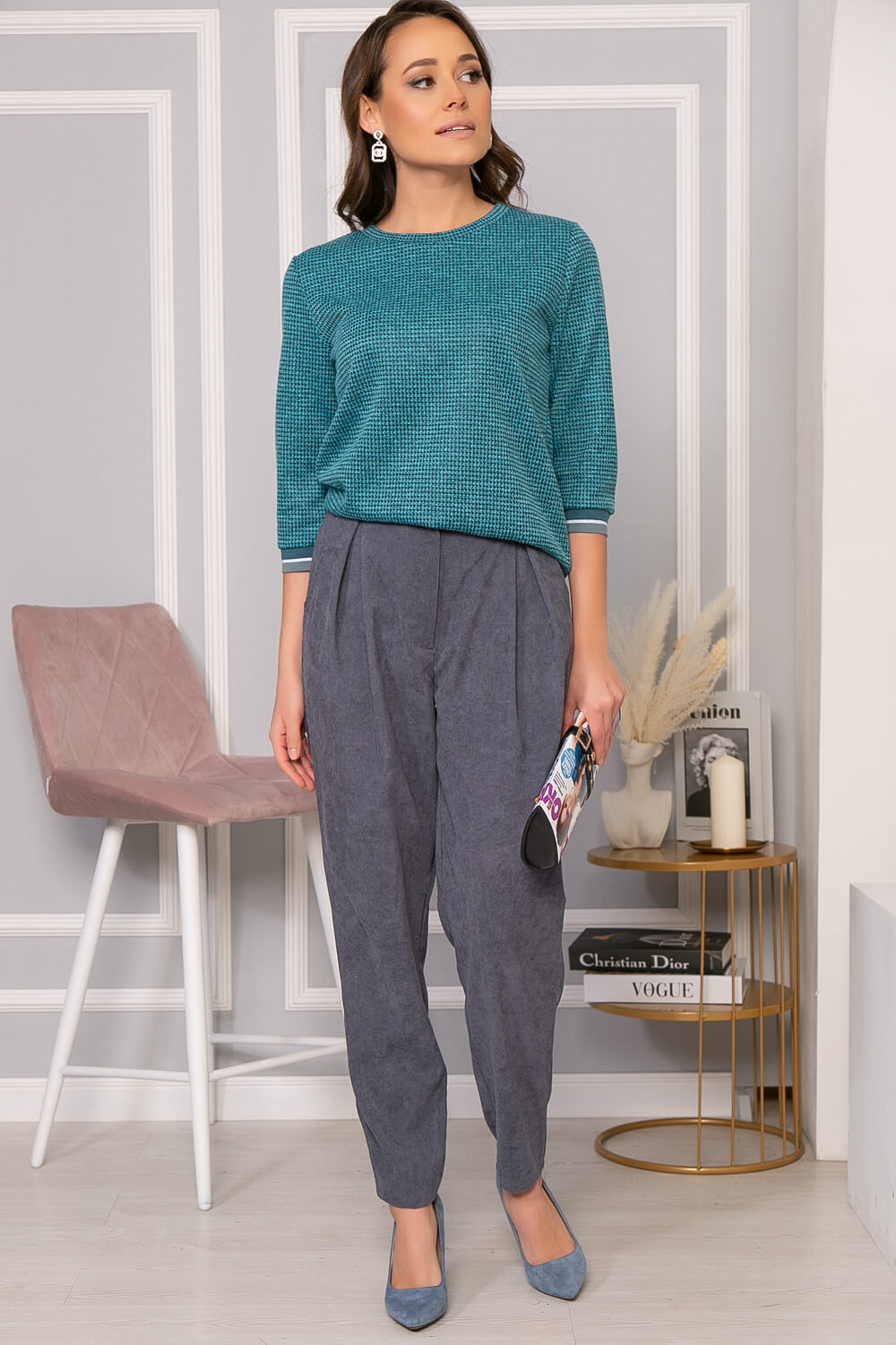 Брюки-бананы из вельвета для создания комфортного образа. Свободная форма брюк за счет складок на бедрах и сужения к низу создает модный женский силуэт. Брюки имеют карманы, по спинке пояс на резинке, обеспечивающий комфортное прилегание. Для создания экстравагантного образа сочетайте их с яркими джемперами. Тем, кто предпочитает классику, подойдут сочетания с изящными свитерами и кофтами.