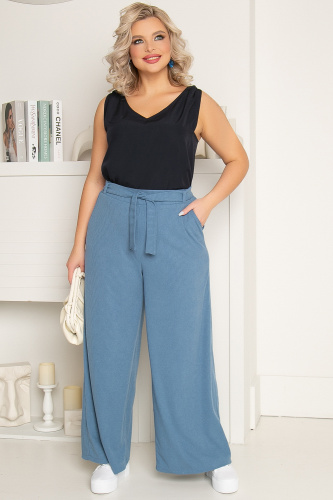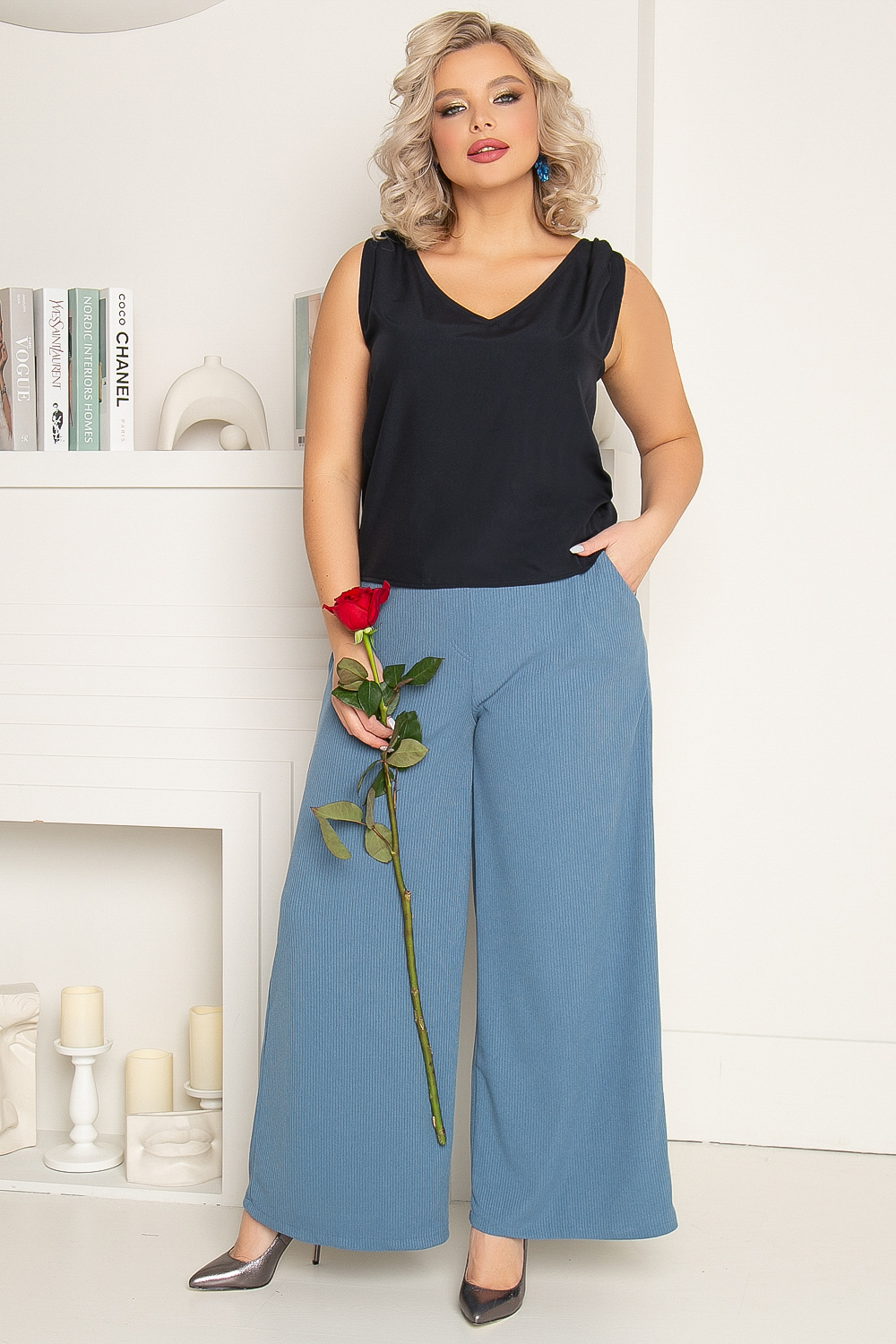 Брюки-палаццо из трикотажа "Лапша" в универсальном джинсовом оттенке. Это фасон брюк, которые отличаются необычайно широкими штанинами и длиной. Они очень удобны благодаря свободному покрою, который не стесняет движений во время ходьбы, придавая изящность и легкость фигуре. Брюки на резинке с поясом из основной ткани.