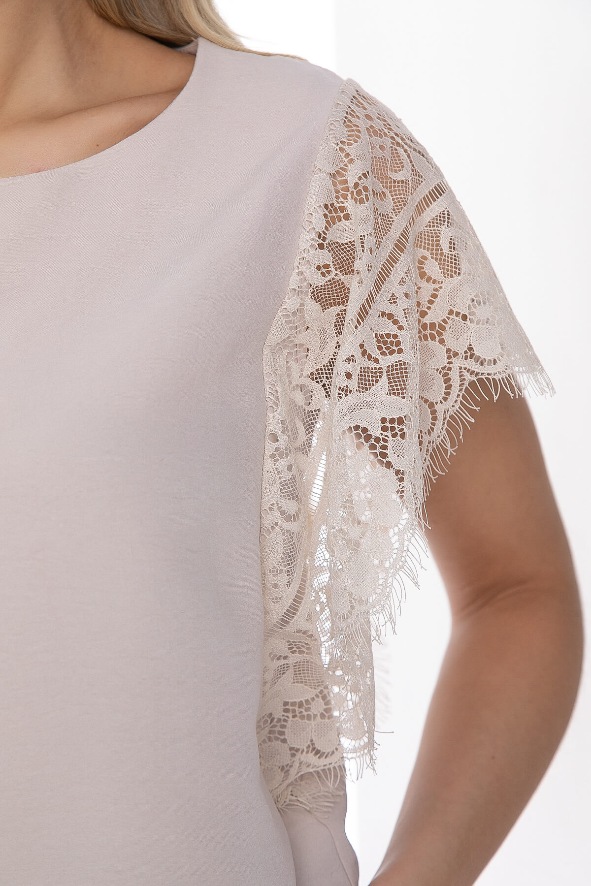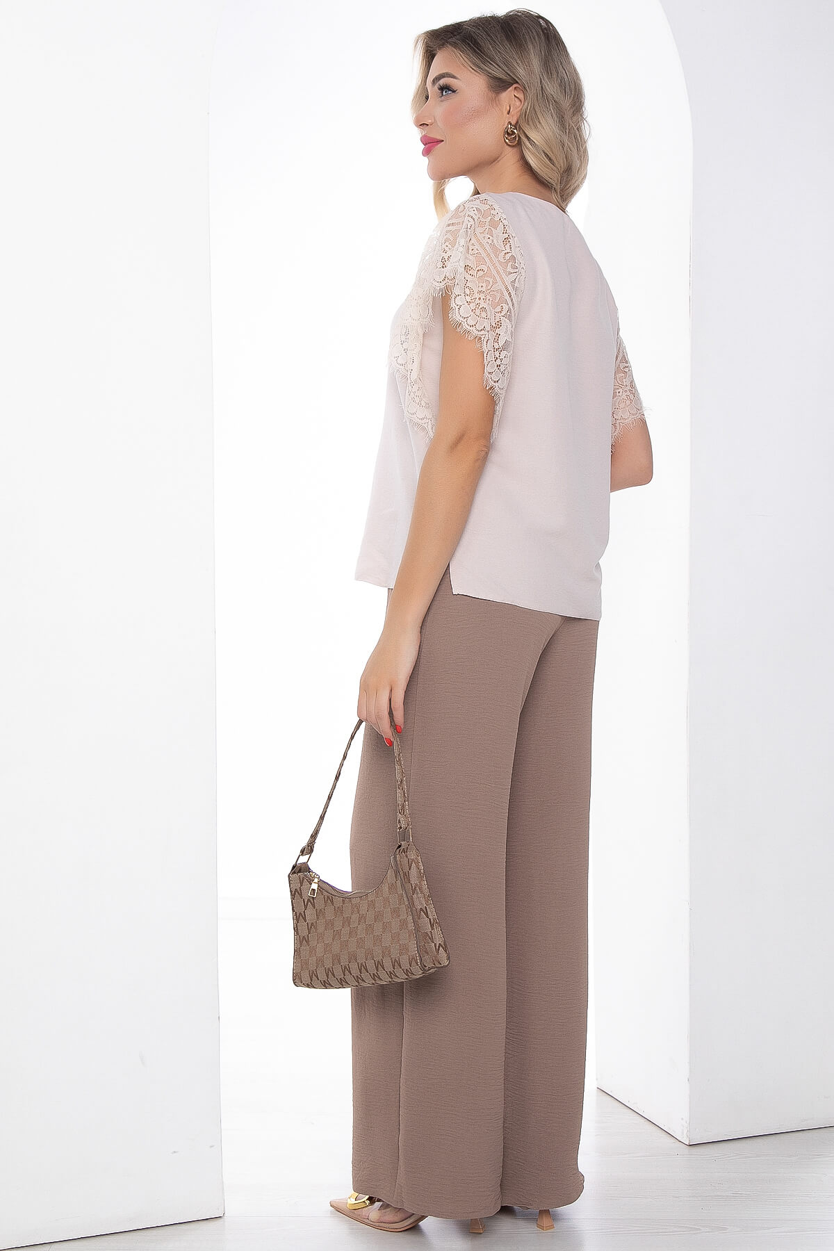 Элегантный костюм, состоящий из брюк с высокой посадкой на резинке и блузы свободного кроя. Очень женственный комплект украшают рукава с кружевом. Отлично подойдет на любое торжественное мероприятие!