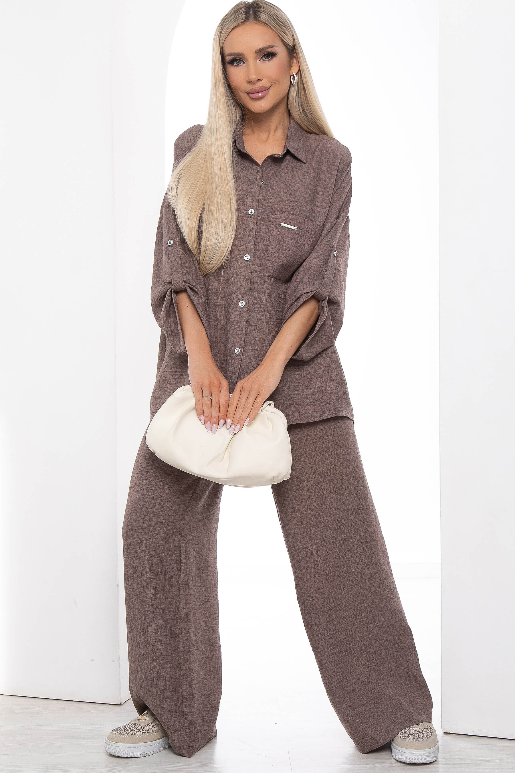 Костюм из лёгкой ткани идеально подойдёт для летнего расслабленного образа. Свободный крой не сковывает движений и дарит комфорт. Рукав длинный, собирается на пату. Спинка - акцентная деталь образа, скроена на запах.