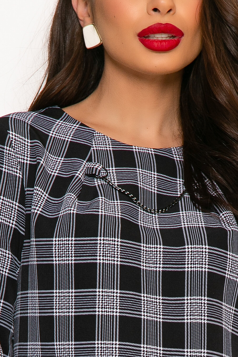 Необычный костюм двойка с туникой свободного кроя и юбкой-полусолнцем создан подчеркнуть Вашу индивидуальность. Классический округлый вырез горловины, рукав втачной, три четверти. Туника декорирована цепями черного цвета на полукольцах, по бокам разрезы, по спинке потайная молния. Юбка на резинке по талии.