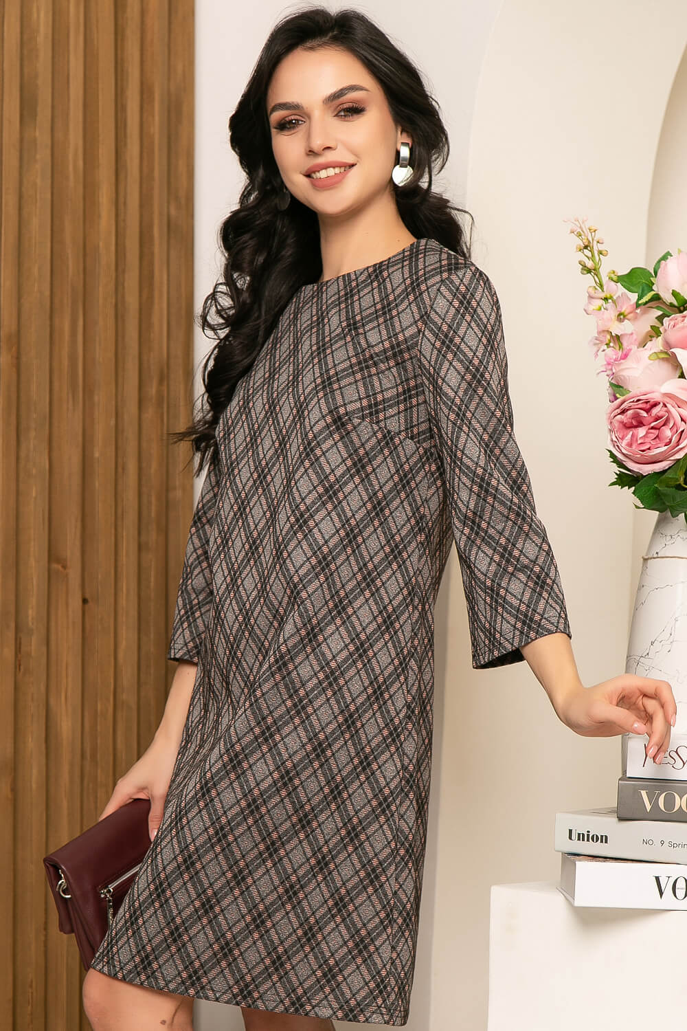 Платье-трапеция с геометрическим принтом из трикотажа - классика повседневного образа. Такой вариант прекрасно подойдёт и для офиса. Рукав втачной, три четверти. Горловина - округлая, обработана обтачкой. Платье без карманов, без подкладки.