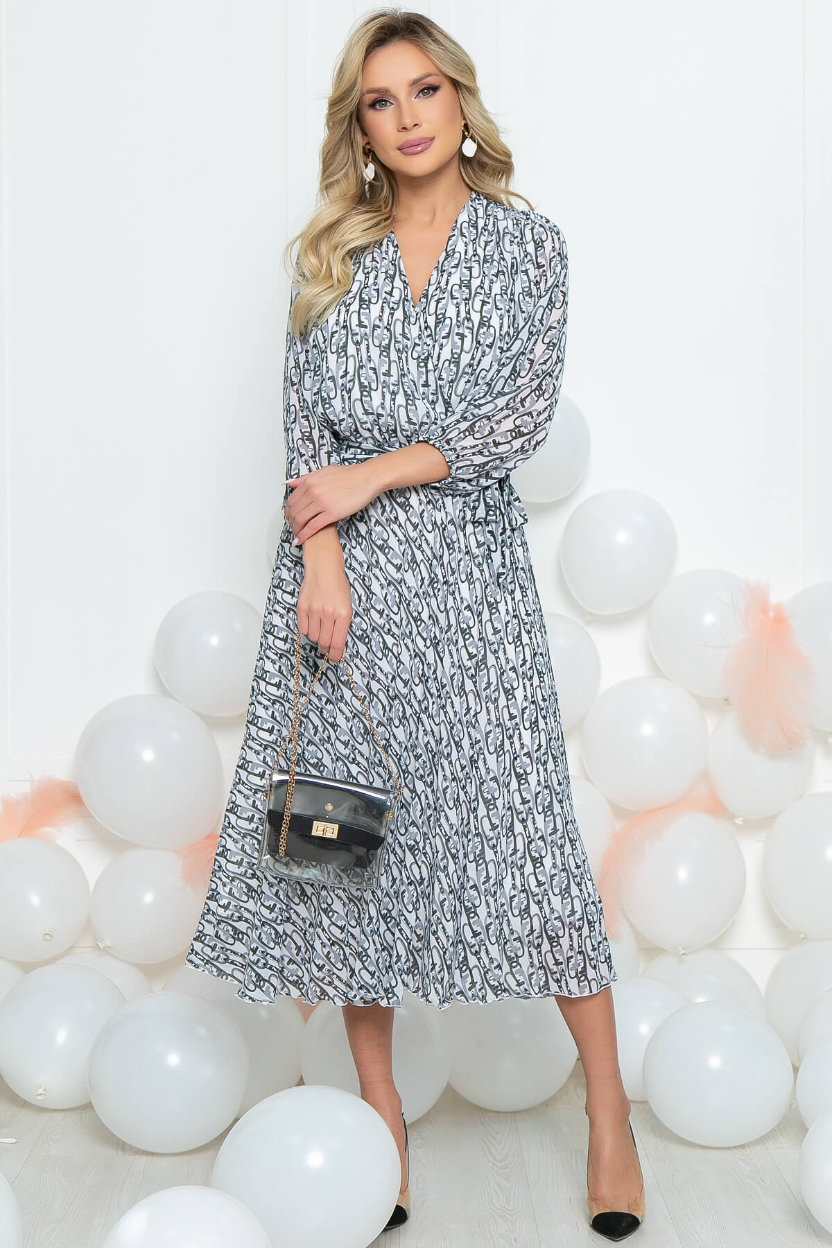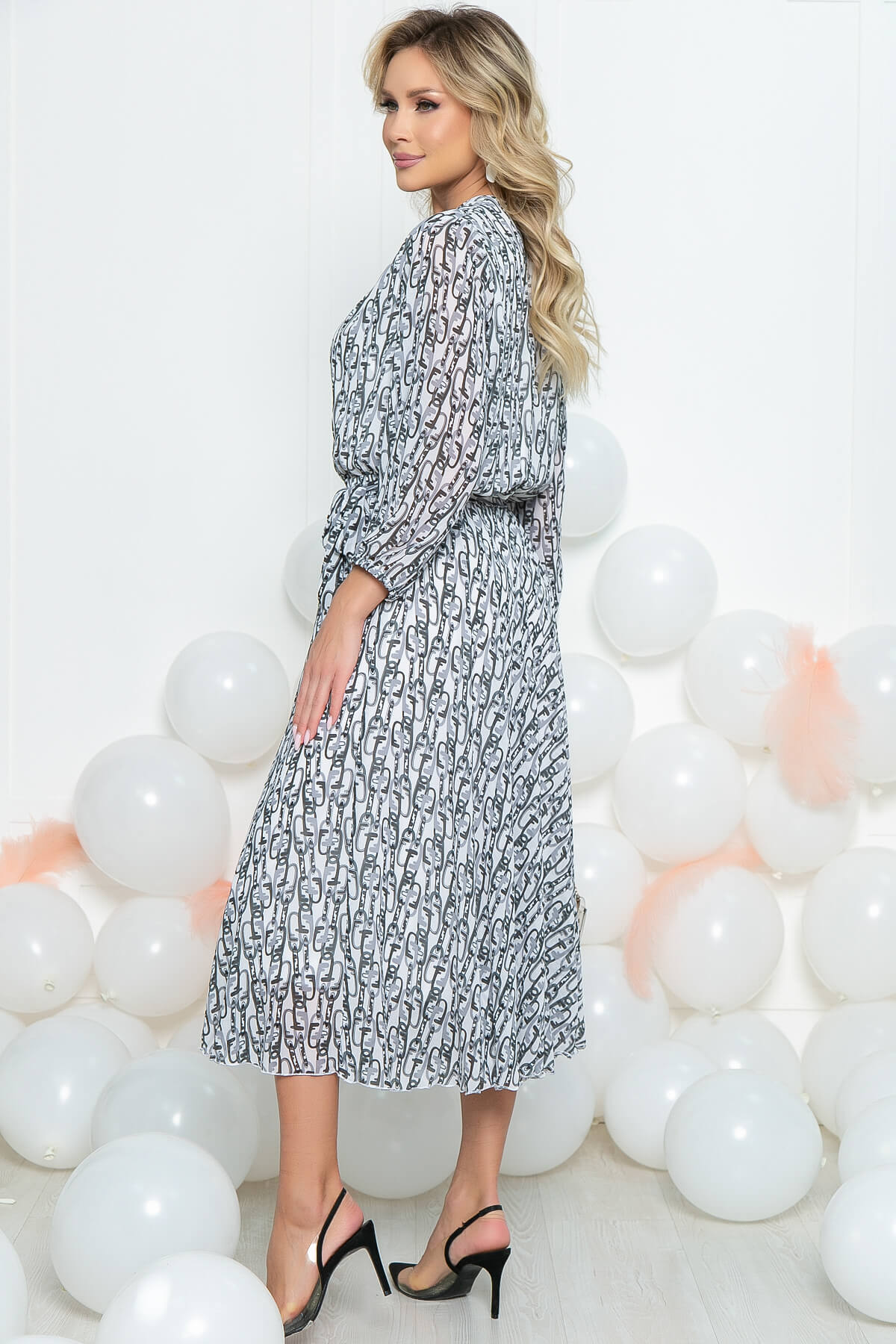 Платье из шифона с оригинальным принтом придаст вам привлекательный вид и создаст прекрасное настроение. Нежная и струящаяся фактура ткани выгодно подчеркнет достоинства фигуры, а пояс из основной ткани сделает акцент на талии.