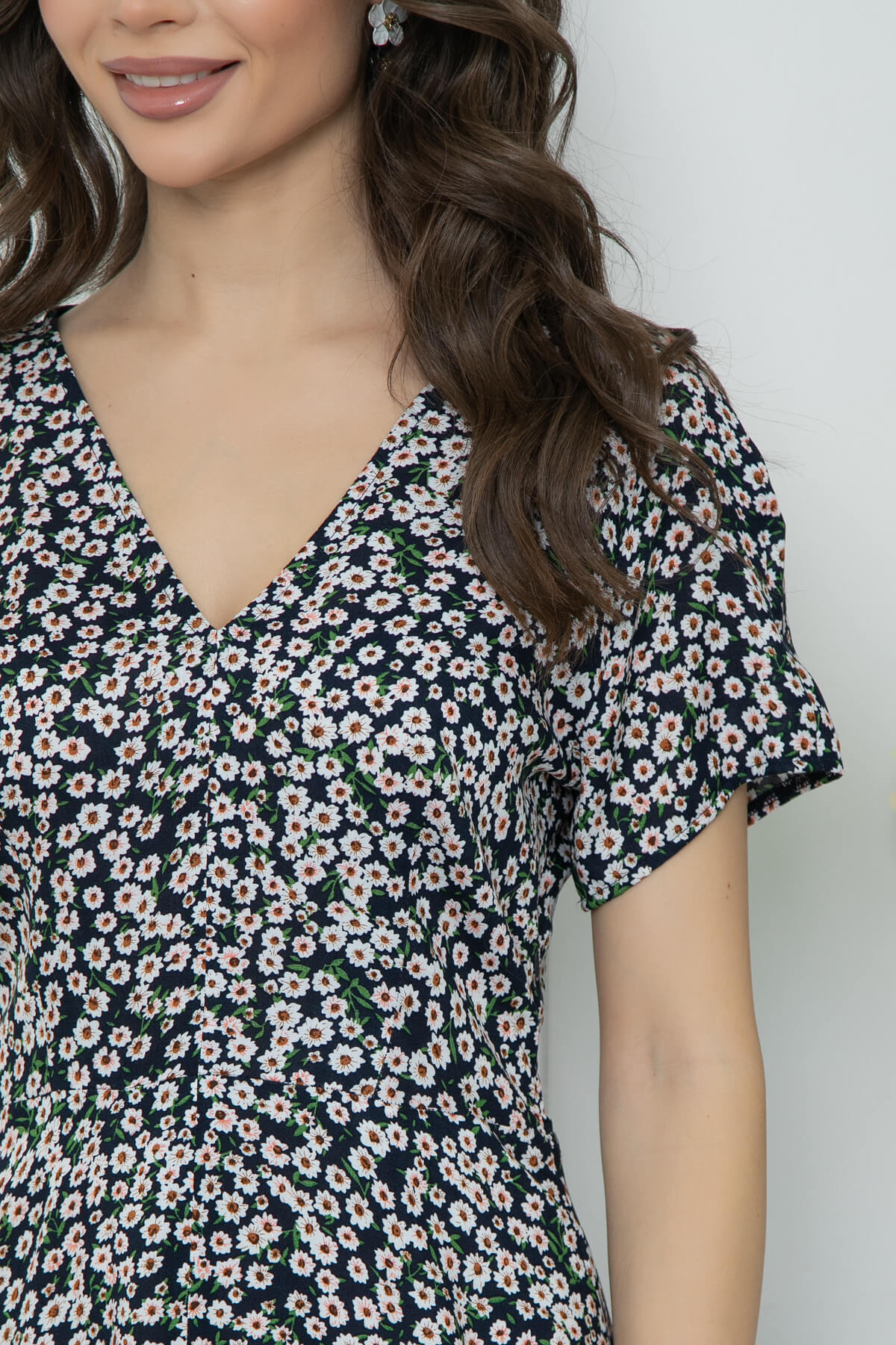 Элегантное платье, которое прекрасно подойдет для прогулки или свидания! Хорошо сочетается с каблучком и с обувью на низком ходу. Хит сезона - платье длины миди из натуральной ткани, с очень популярным сейчас цветочным принтом. Мягкий V-образный вырез красиво подчёркивает шею, тонкий поясок - подчеркнет талию. Небольшой разрез по переду выразительно подчеркнет и удлинит Ваши ножки! В боковом шве потайная молния.