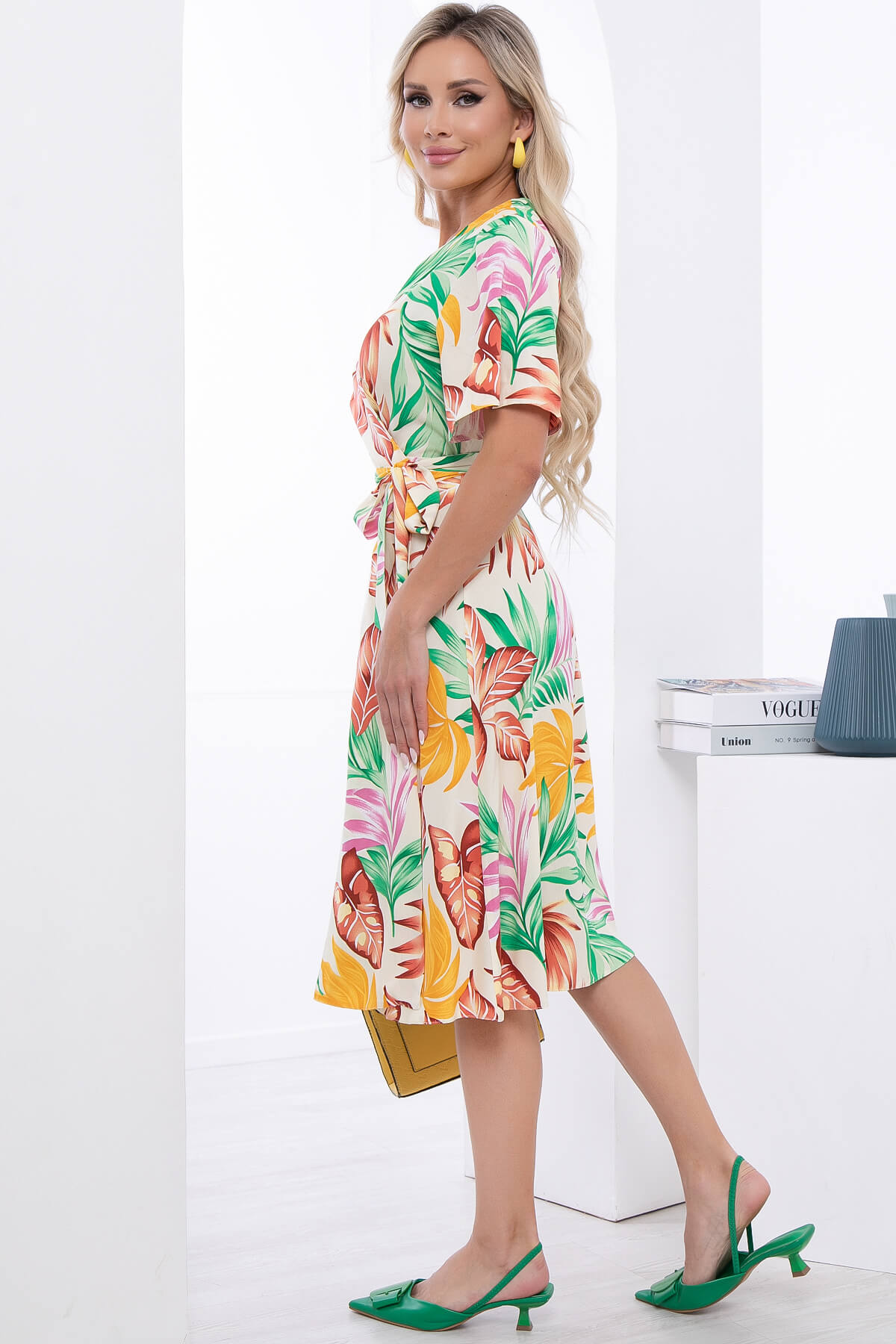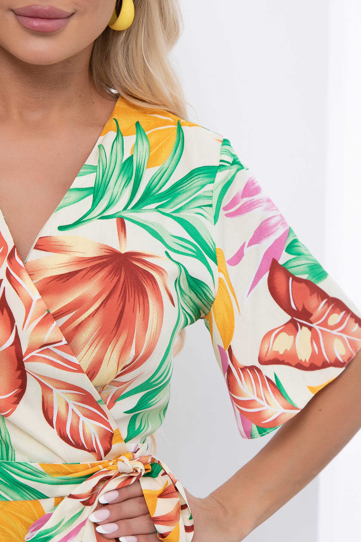 Яркое платье не оставит вас без внимания окружающих! Стильное платье, в котором вы будете ощущать себя женственно и привлекательно. Платье на запах со вшитым поясом обеспечит комфорт. Рукав укороченный, цельнокроенный.