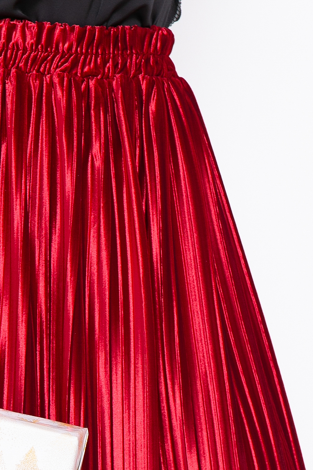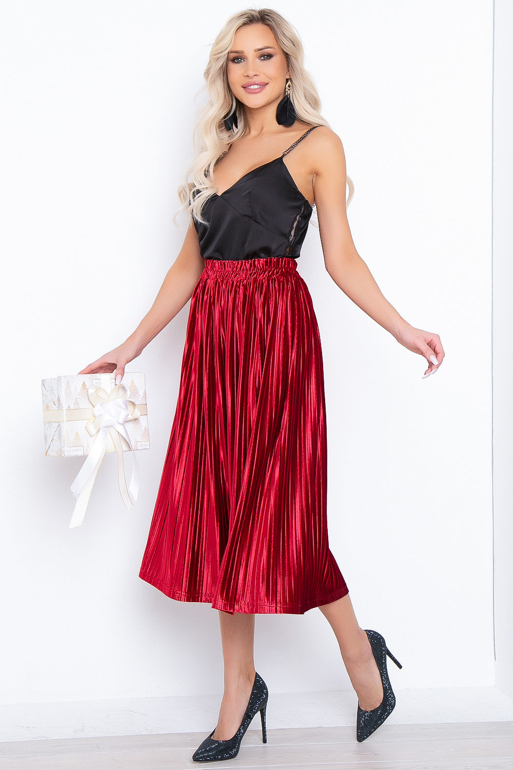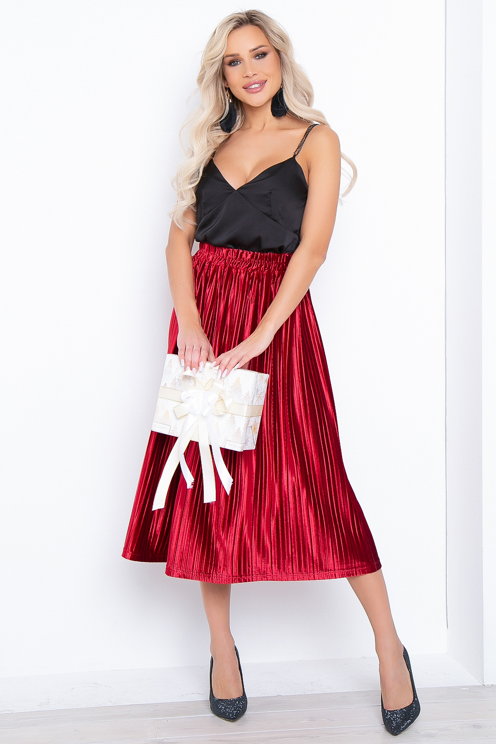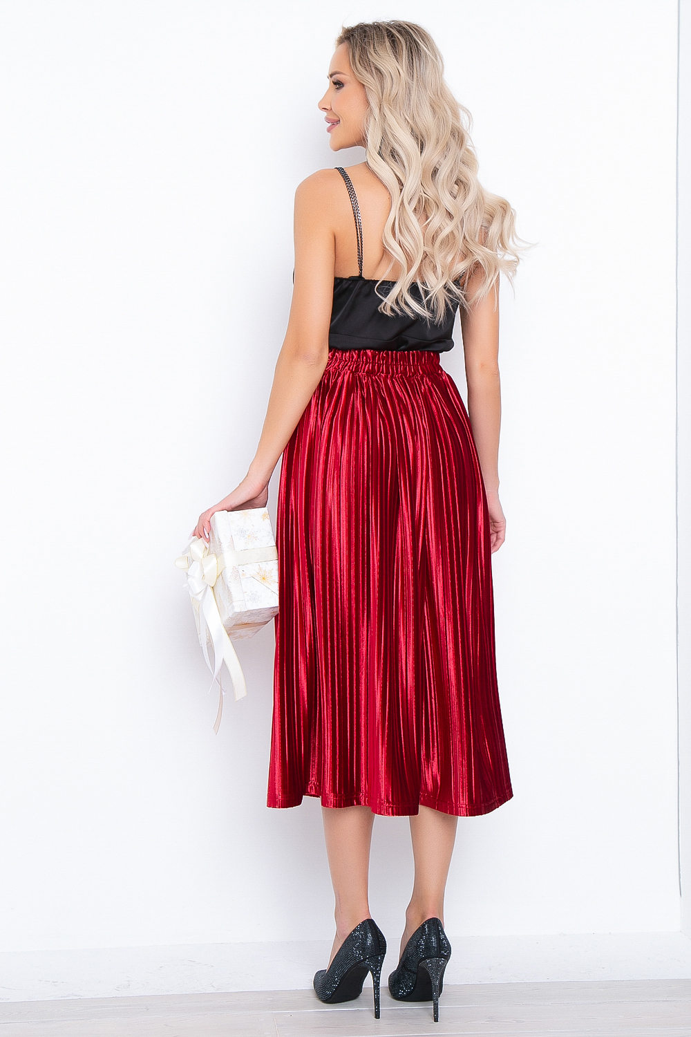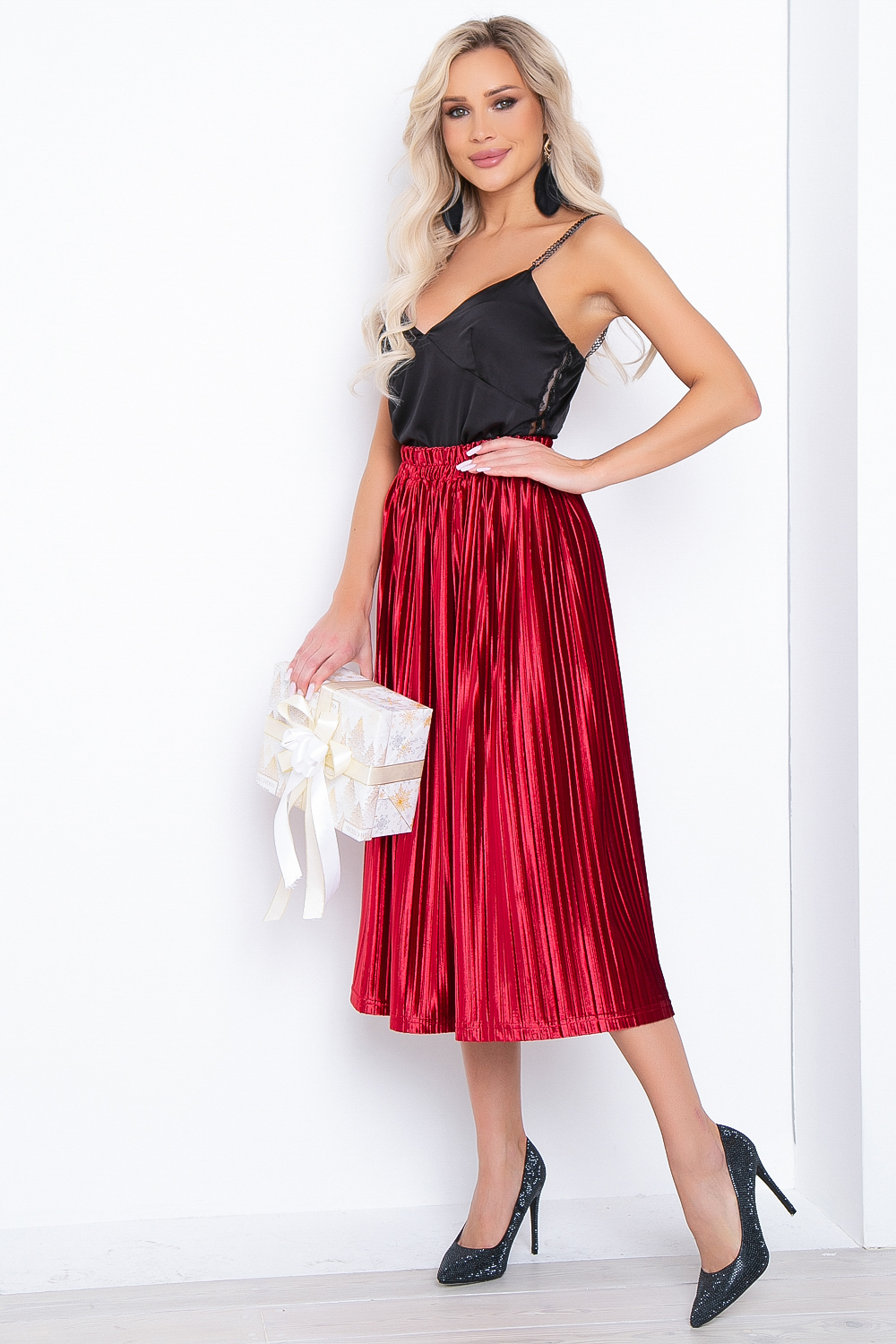 - Юбка полусолнце из плиссированного бархата в дорогом алом оттенке;