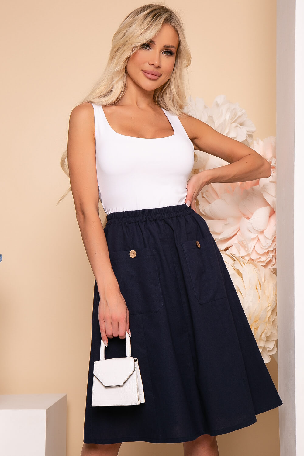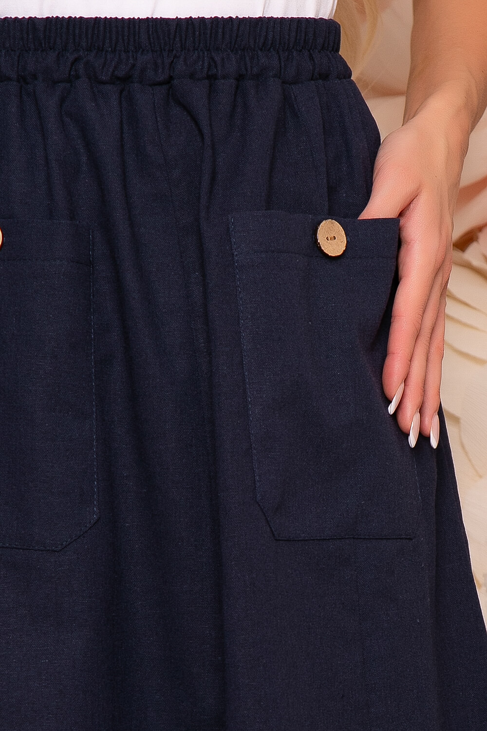 Юбка-трапеция тёмно-синего цвета прекрасно подойдёт для активного отдыха или же для будней в энергичном ритме. Юбка станет украшением Вашего образа благодаря своему цвету и фасону. Юбка на резинке, по переду накладные карманы. Юбка без замков, без подкладки.