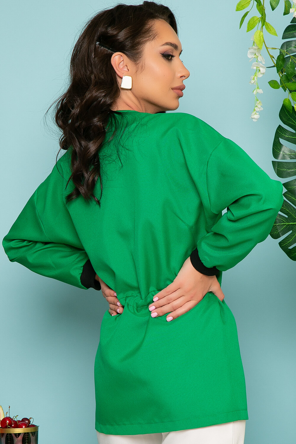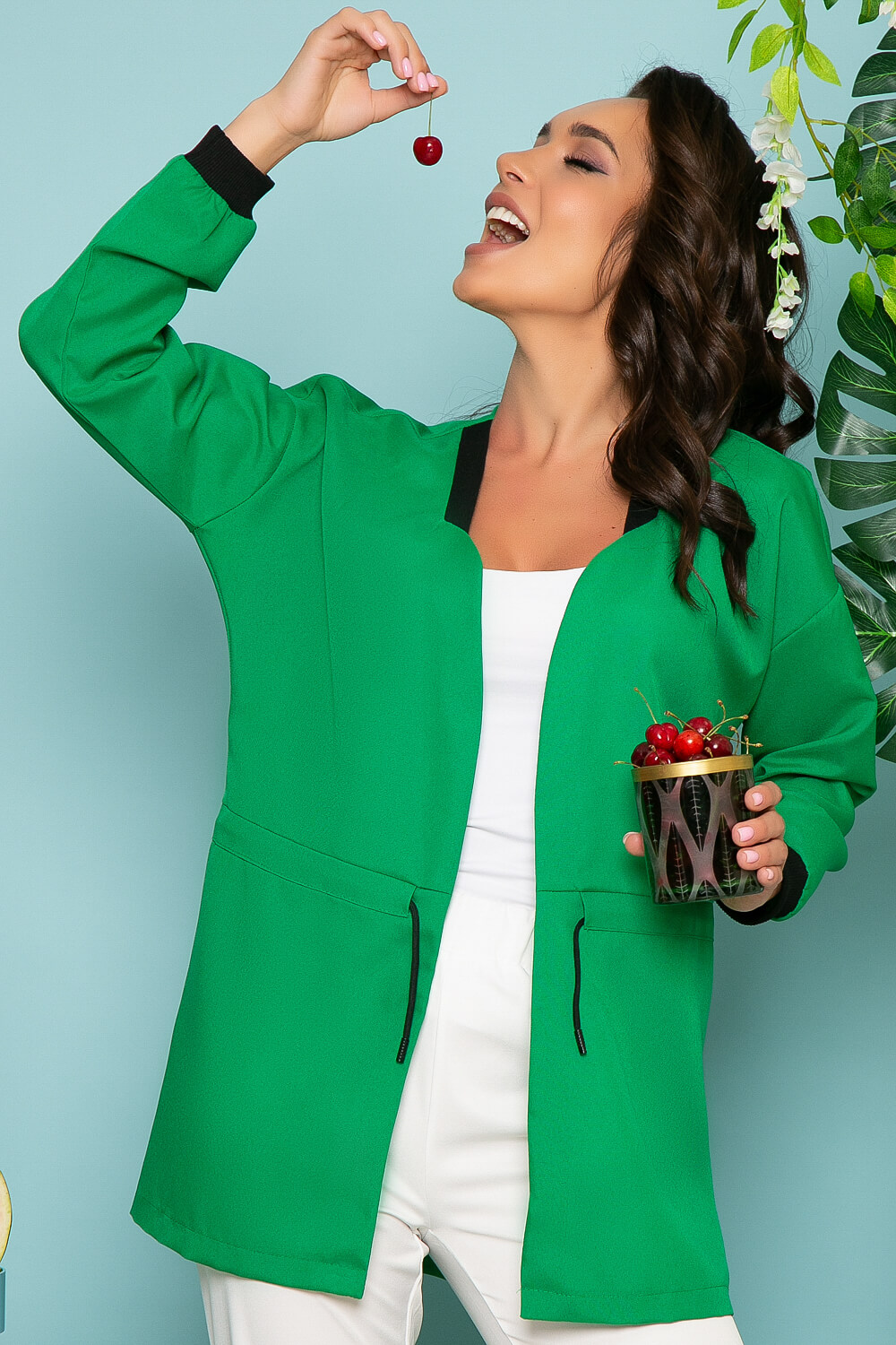 Жакет из костюмной ткани подойдёт как для офисных образов, так и стильно дополнит повседневные. Пояс-кулиска позволяет подчеркнуть линию талии. Рукав и отделка воротника оформлены чёрной мягкой резинкой. Рукав длинный, втачной, линия плеча спущена.