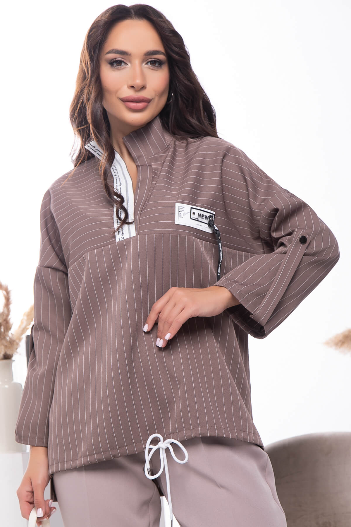 Рубашка, как базовая вещь, отлично дополнит любой образ: офисный, деловой или повседневный. Может стать частью многослойного образа или изюминкой комплекта с брюками или джинсами. Рубашка свободного кроя с отрезной кокеткой. Рукав втачной, три четверти. Воротник-стойка, без застёжки, украшена декоративной лентой.
