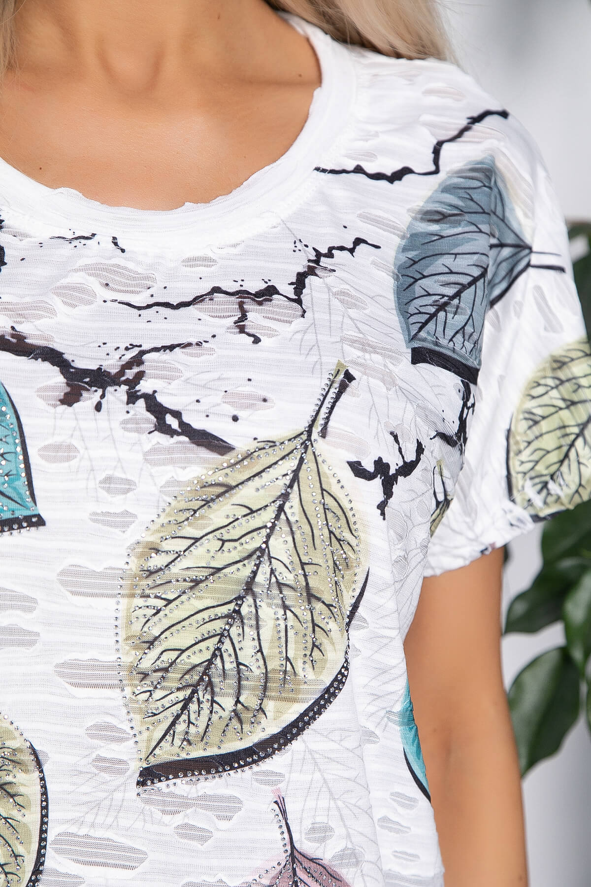 Лёгкая и стильная блузка с принтом, стразами и имитацией рванности выделит вас из толпы! Несмотря на свой яркий дизайн она прекрасно будет сочетаться с любой одеждой в вашем гардеробе. Блузка комфортная и пригодится для всех случаев - будь то повседневные прогулки, отпуск, или праздничный вечер.