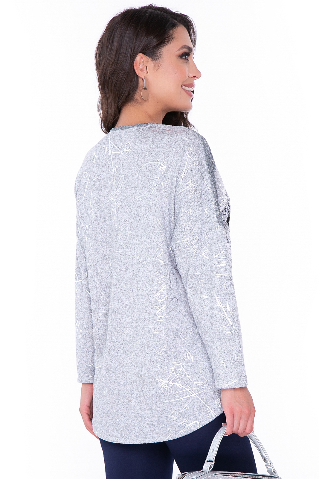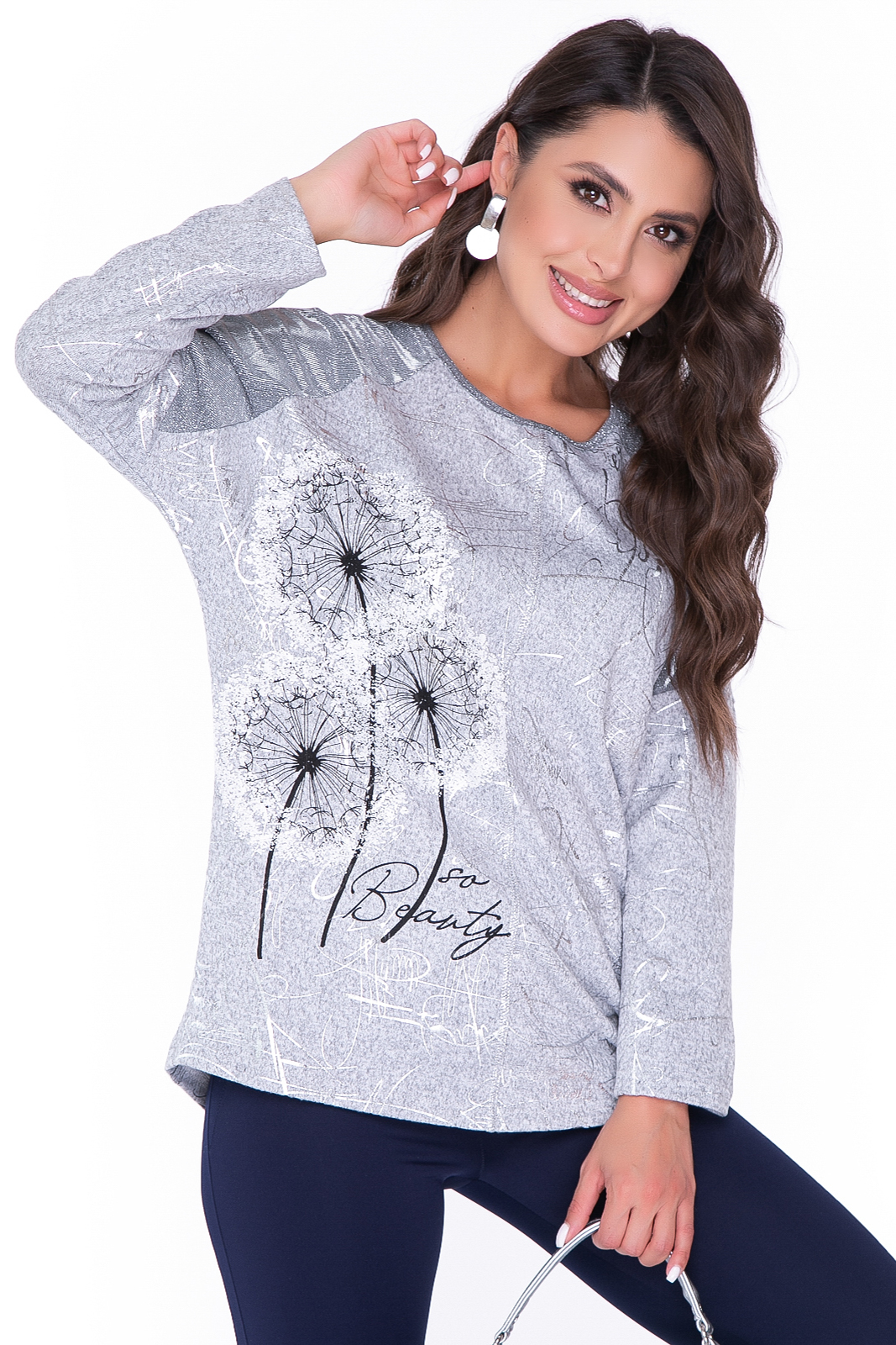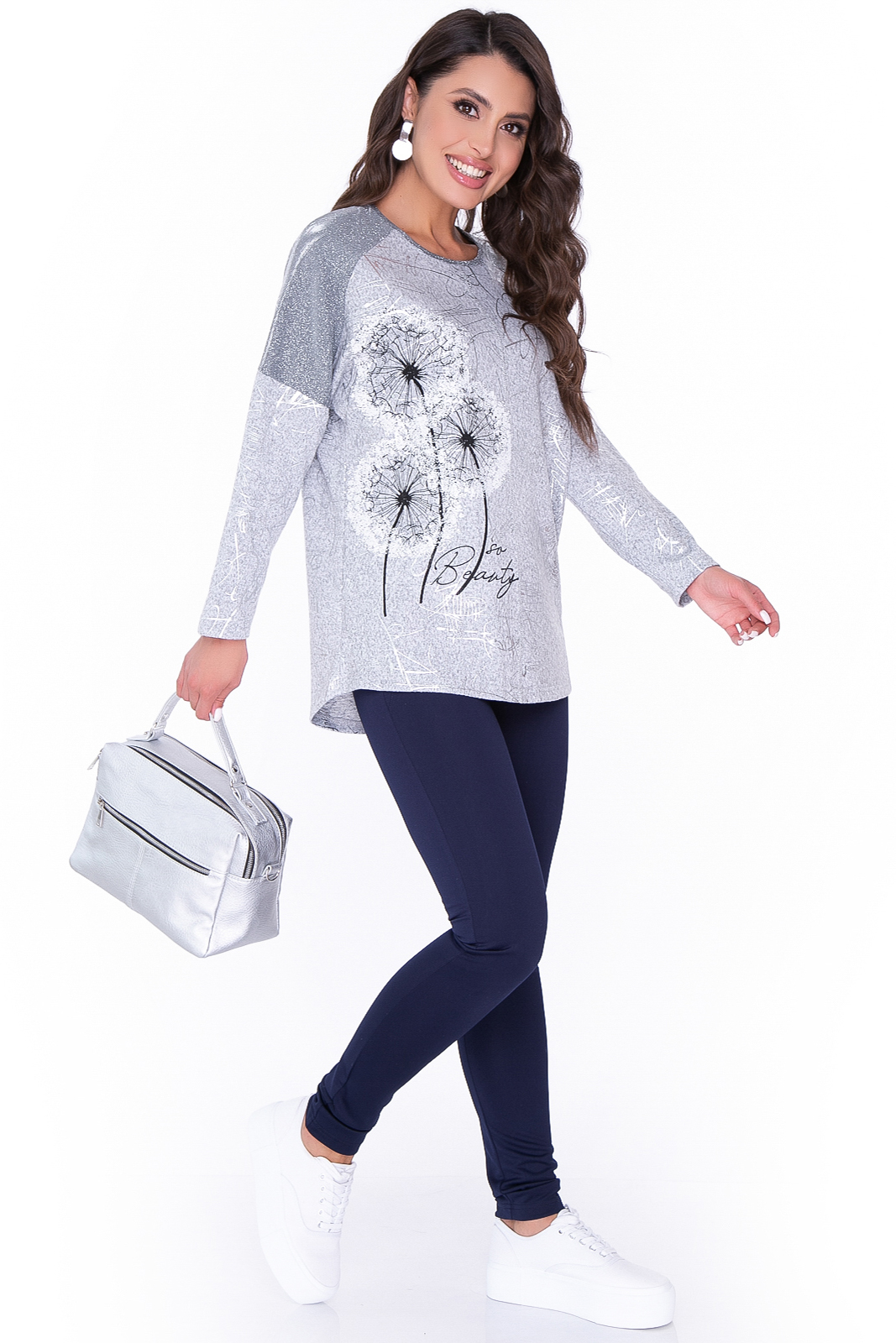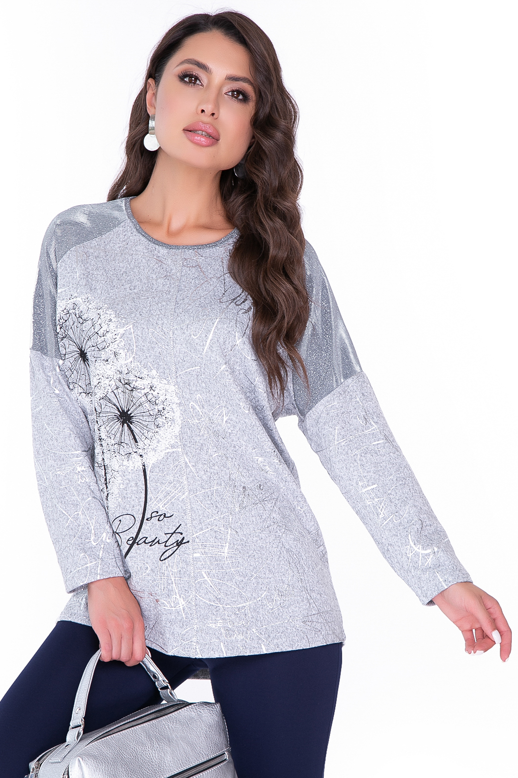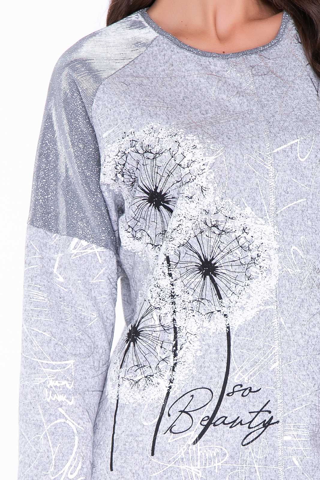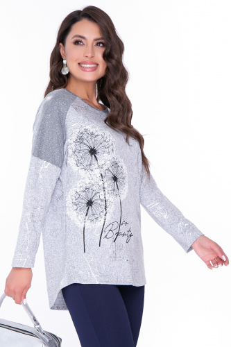 - Туника в базовом сером оттенке, по переду нанесен рисунок "одуванчики" и серебристыми надписями;