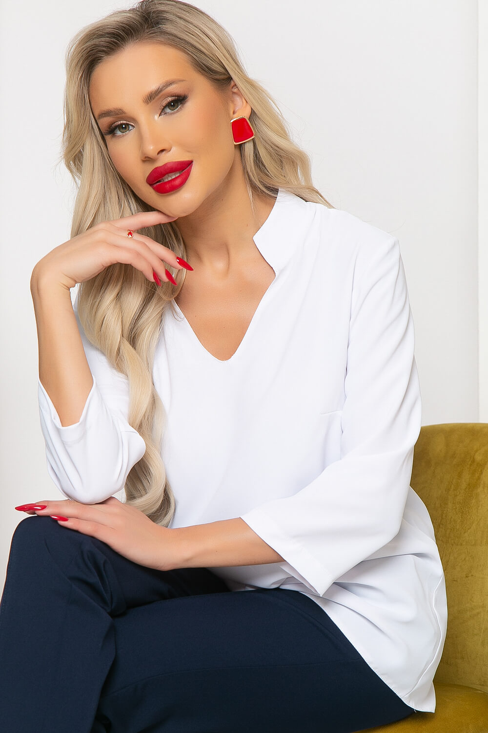 Классическая блуза белого цвета с акцентным воротником-стойкой легко впишется в Ваш базовый гардероб, добавит образу женственности и элегантности. Блуза свободного кроя с укороченным рукавом создаст максимум комфорта. Благодаря фасону и цвету легко комбинируется с другими вещами из вашего гардероба.