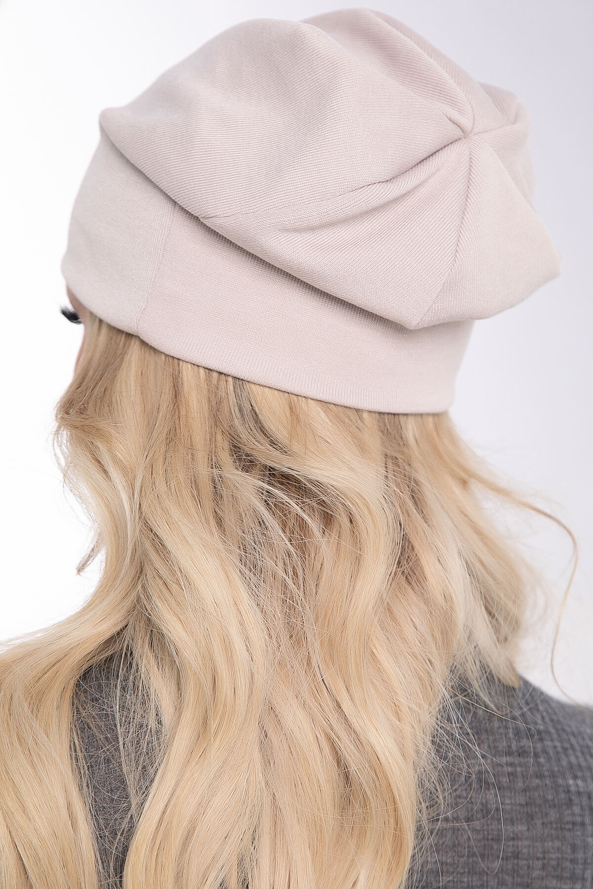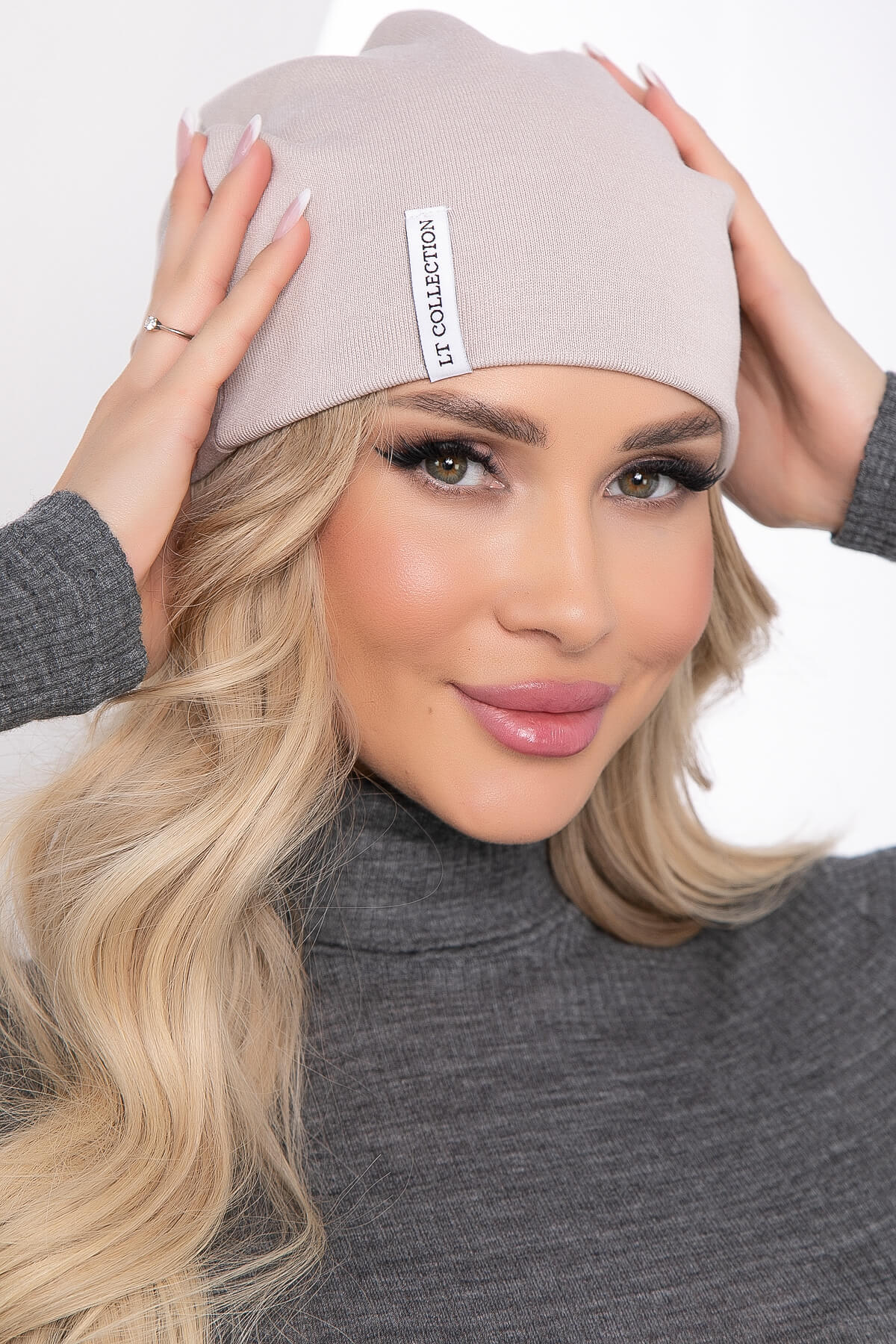 Брендовая шапка LT Collection из трикотажа нежного бежевого цвета. Шапка имеет универсальную форму, состоит из 6-ти клиньев и подходит для любой формы лица. Можно носить с отгибкой и без.