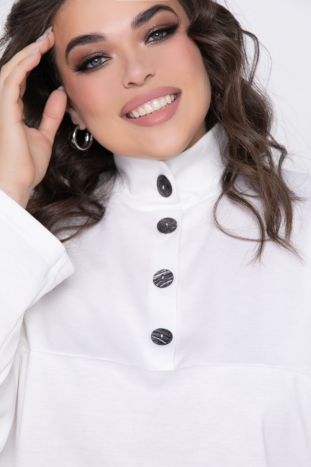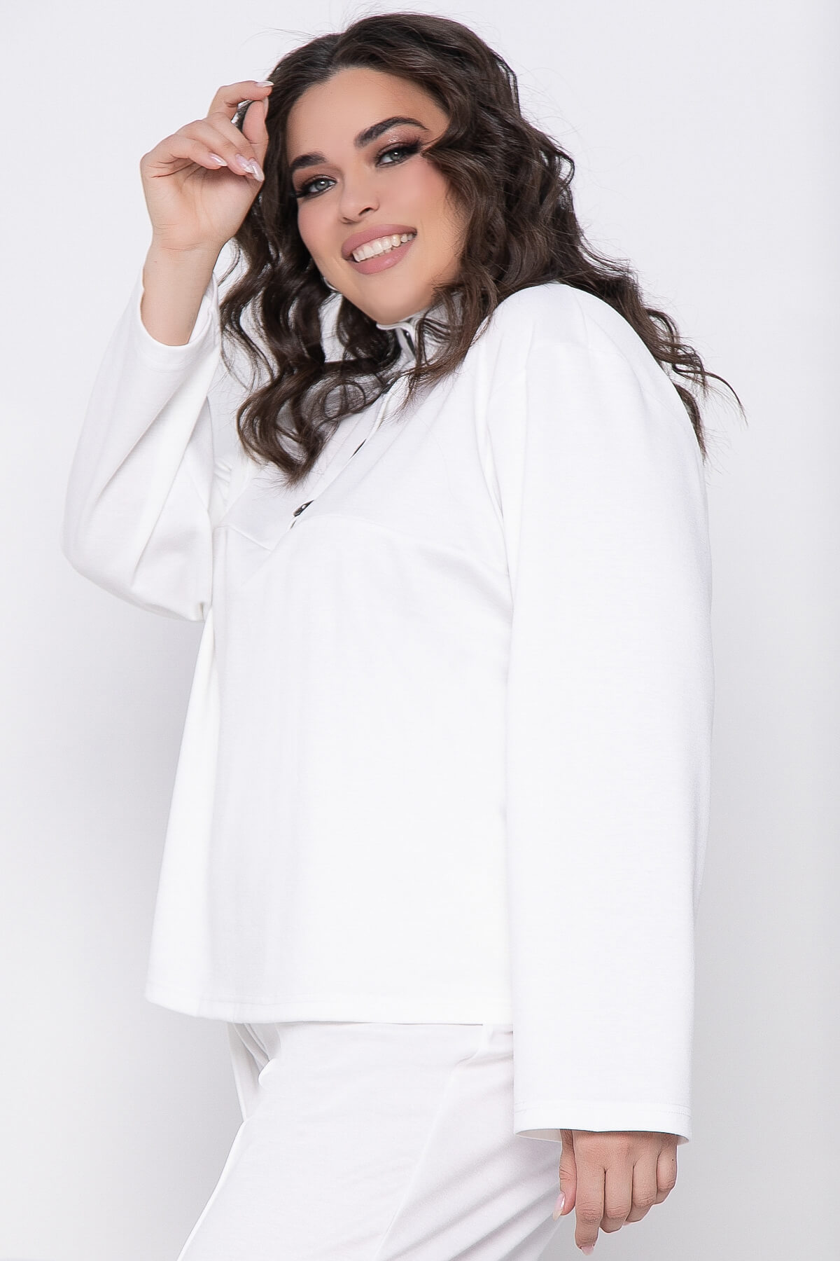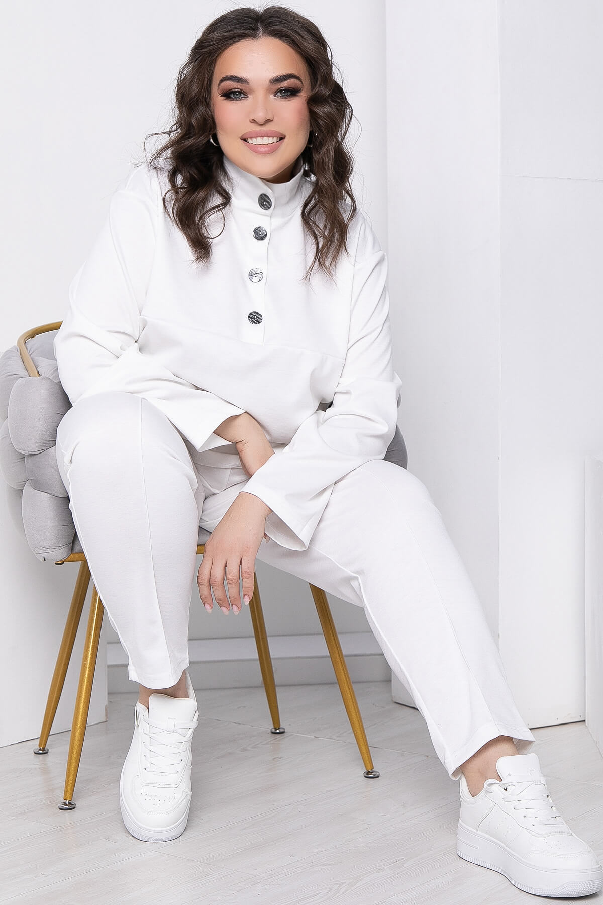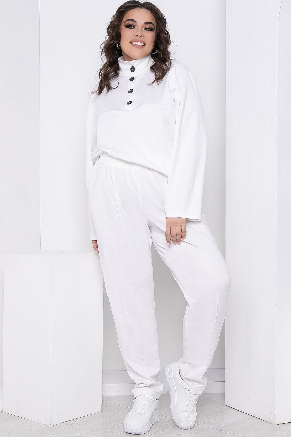 Костюм-двойка, состоящий из классических брюк прямого кроя и свободного джемпера с воротником стойкой на пуговицах. Брюки на резинке, в боковых швах есть карманы. В таком трикотажном костюме можно смело отправиться на прогулку или на встречу с друзьями. Целый день вам будет уютно и комфортно. Пуговицы с легким перламутровым отливом придают оригинальность образу. На брюках отстроченные стрелки.