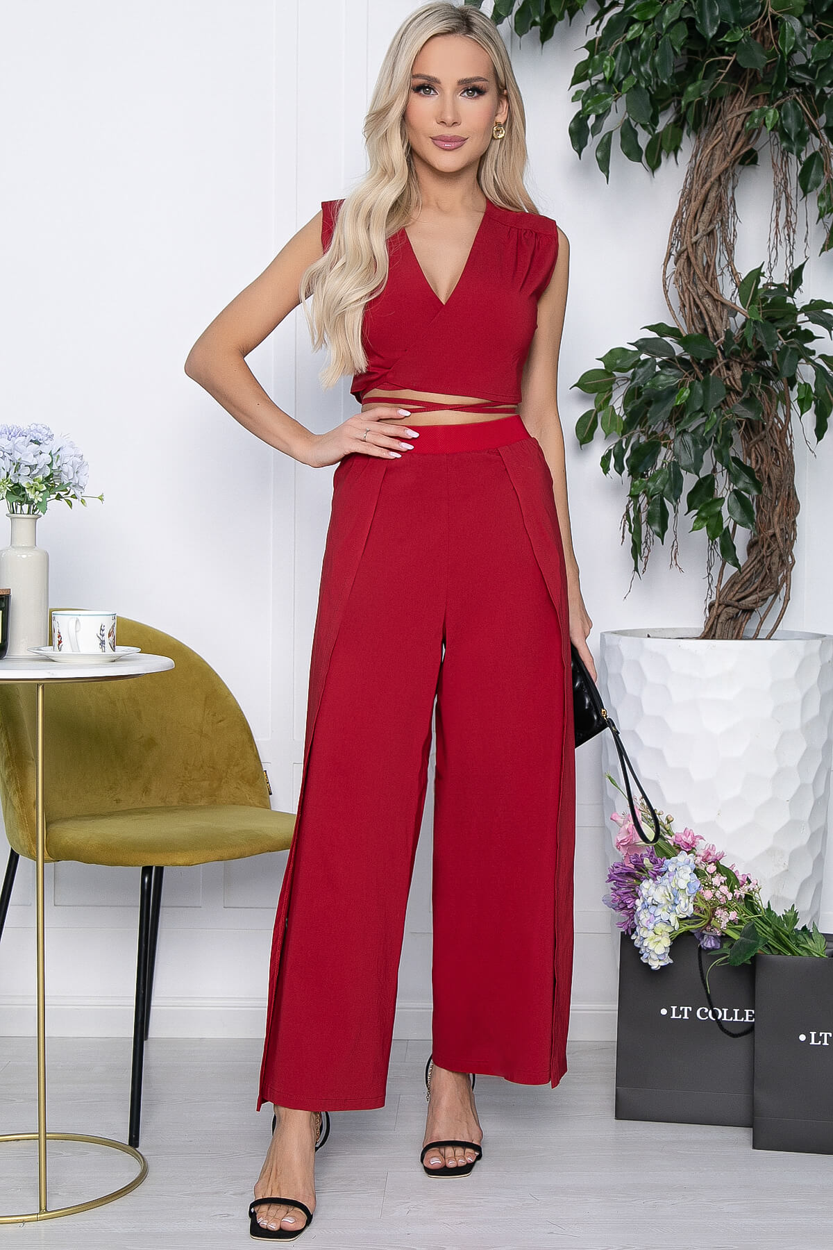 Шикарный костюм на лето. Топ без рукавов. Умеренно-глубокий V-образный вырез на запах регулируется завязками. Брюки на широкой резинке. Запахивающиеся штаны придают всему образу легкость и чувственность, добавляя неотразимости. Без подкладки.