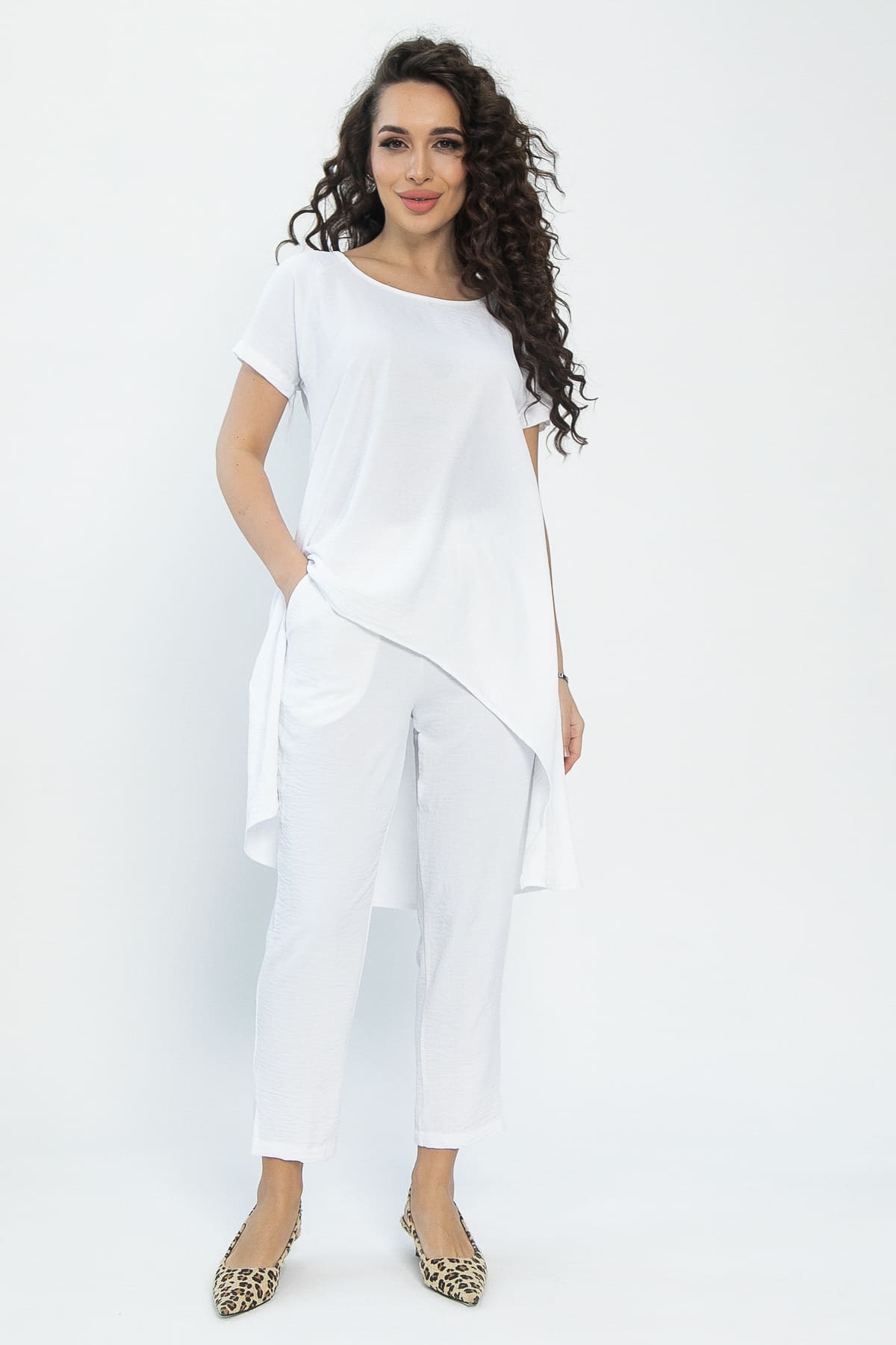С этим комплектом вы будете ощущать себя комфортно, независимо от того, где вы находитесь. Необычный фасон придаст свежести вашему летнему гардеробу. Костюм состоит из туники и укороченных брюк! Брюки заужены к низу, по бокам снизу разрезы, карманы в боковых швах, талия на резинке. Туника А-силуэта с асимметричным низом, рукав кроя «реглан».
