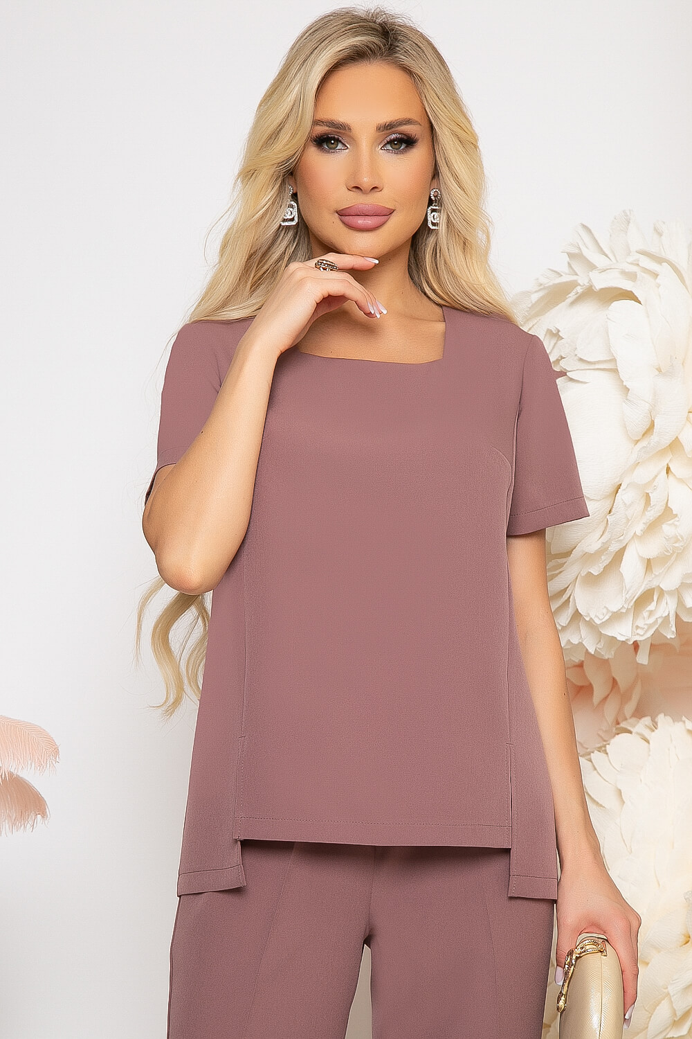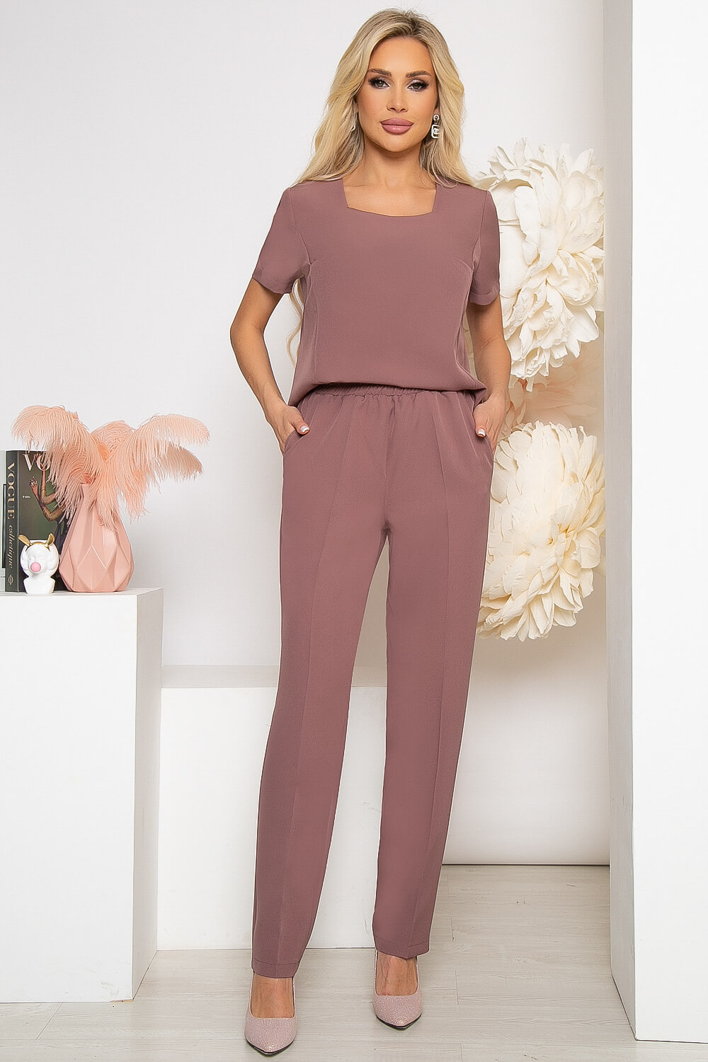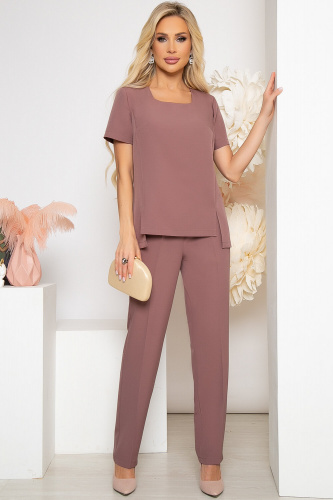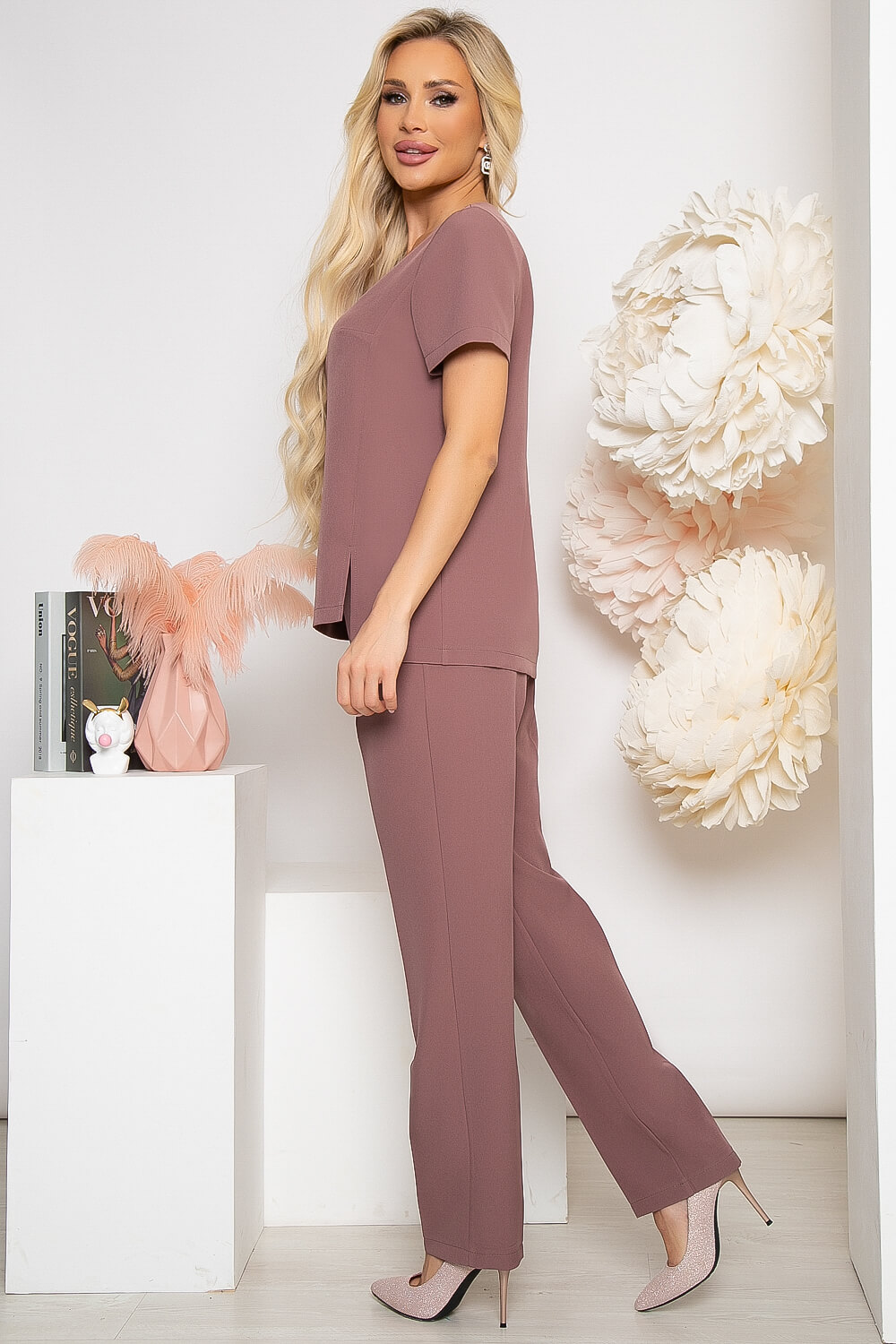 Брючный костюм в красивом оттенке "Какао" подойдёт для создания красивого делового образа. Модели с брюками консервативны, они стали полноценным элементом офисного стиля. Их можно обыграть, сделав более раскованными, соблазнительными и женственными. Все, что нужно - выбрать подходящие аксессуары! Блуза свободного кроя, спереди небольшие разрезы, спинка удлиненная. Классический вырез горловины, рукав короткий, втачной. Брюки из костюмной ткани на резинке, прямого кроя, с удобными карманами в боковых швах.