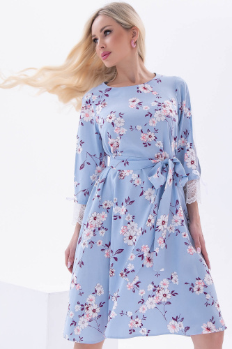 Платье, наполненное всеми атрибутами женственности. Лёгкое, струящееся платье подойдёт для любого типа фигуры за счет свободного кроя. При помощи пояса, входящего в комплект, можно подчеркнуть линию талии. Вырез горловины - округлый. Рукав втачной, три четверти, украшен сеткой с кружевом по нижнему краю и атласными лентами.