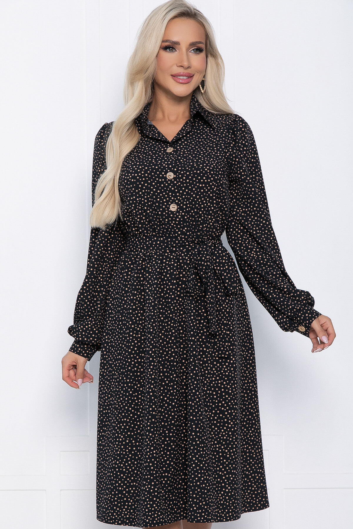 Чёрное платье в горошек длиной миди отлично подойдет для вечернего выхода, так и для повседневного образа. Платье отрезное по талии, и на резинке. По переду застёгивается на пуговицы, пояс из основной ткани входит в комплект.