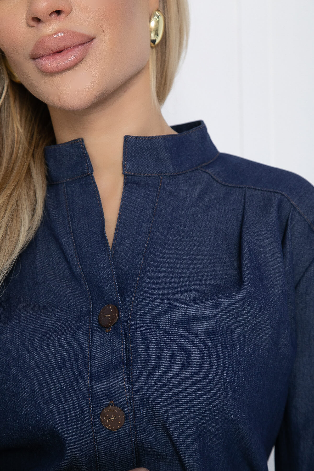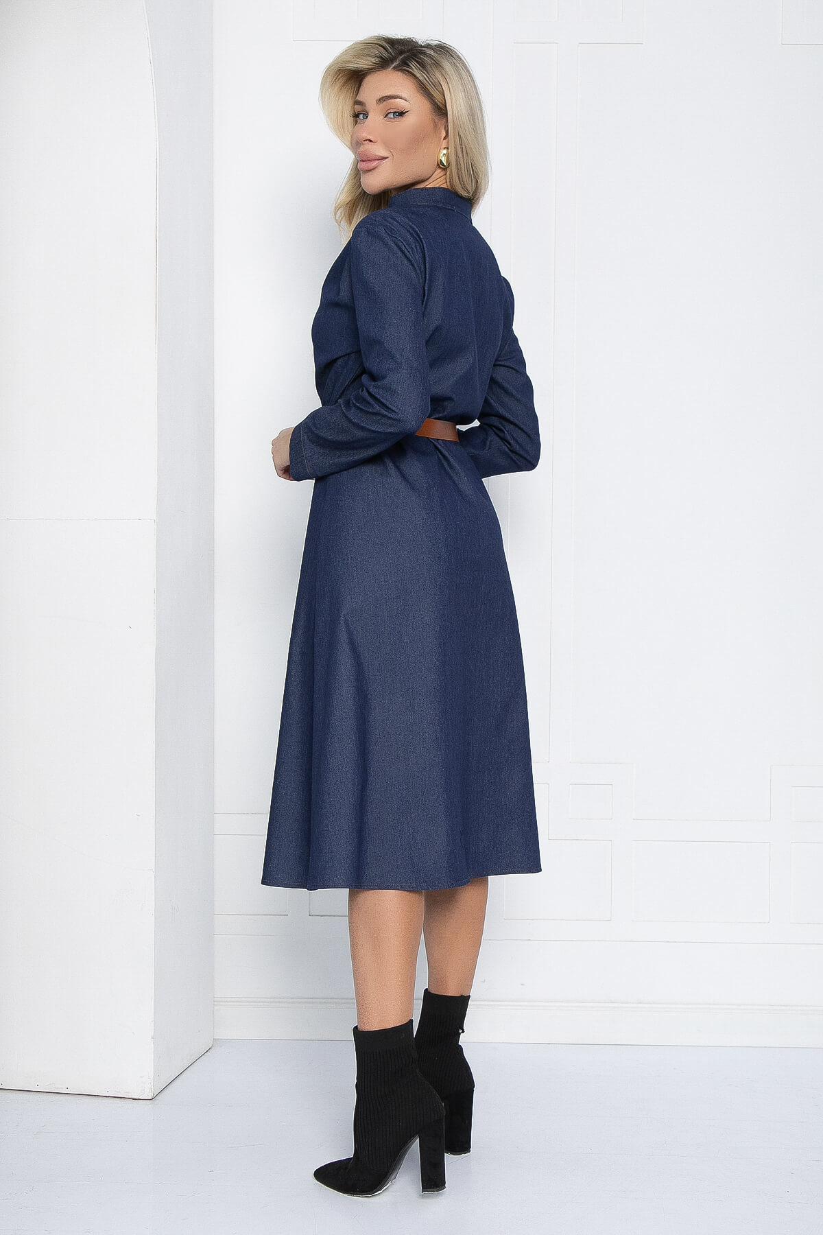 Джинсовое платье с длинным рукавом станет настоящим украшением вашего гардероба. Отрезная талия выгодно подчеркивает фигуру, создавая элегантный образ. Декоративные складки спереди от плеча добавляют изюминку, а планка с пуговицами и воротник-стойка придают платью классический вид. Отделка цветными нитками придает игривости и индивидуальности. В комплект к платью идет кожаный ремешок, который завершает образ.