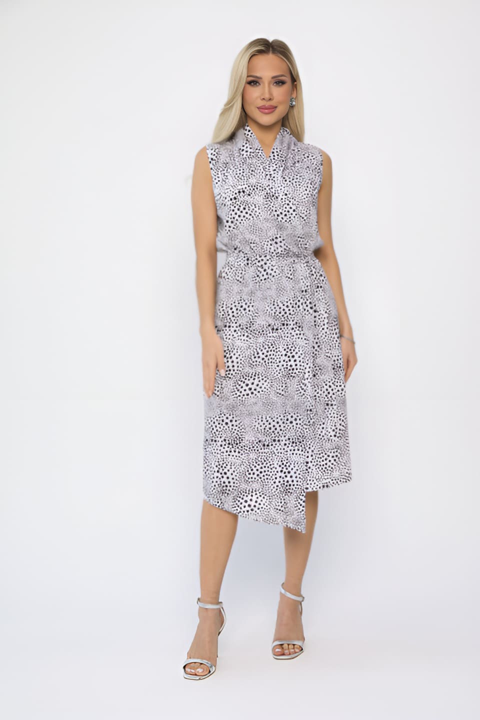 Элегантное платье без рукавов, выполненное в стильном дизайне на запах, идеально подходит для создания женственного образа. Драпировка на лифе придает изящество и подчеркивает фигуру, а резинка по линии талии обеспечивает комфортную посадку и акцентирует талию. Пояс в цвет платья завершает образ и добавляет нотку утонченности. Ассиметричный низ юбки добавляет динамики и оригинальности, делая это платье отличным выбором для особых случаев или повседневной носки. Сочетайте с любимыми аксессуарами и обувью для создания стильного ансамбля!