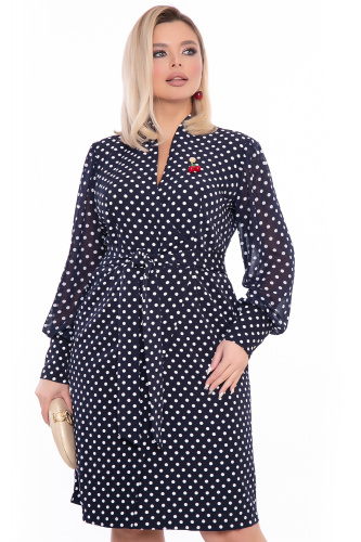 Стильное платье из трикотажа в горох на каждый день! В нём Вы будете выглядеть элегантно и привлекательно! Платье приталенного силуэта, верх скроен по типу "Запах". В комплекте пояс из основной ткани, в боковом шве потайная молния. Длинный рукав на широкой манжете, застегивается на четыре яркие пуговки, которые гармонируют с брошью-вишенками.