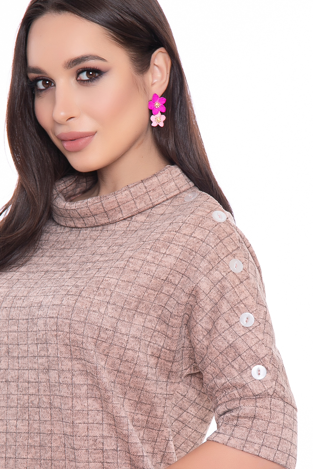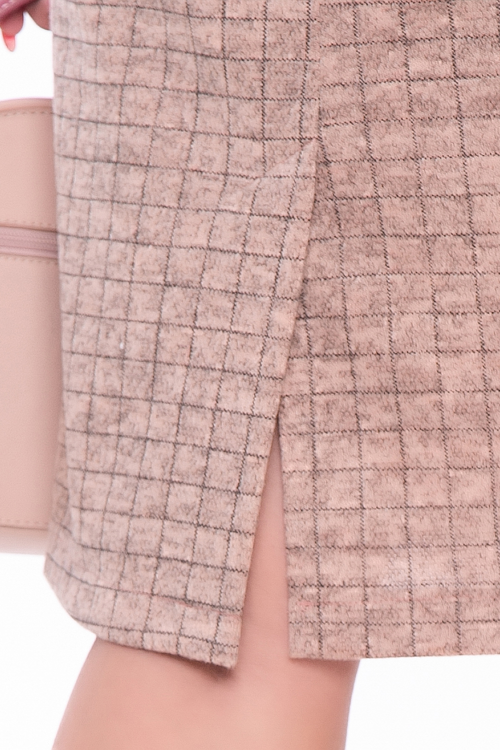 Женственное платье из трикотажа в нежном персиковом оттенке. Платье прямого фасона, спинка разрезная, на юбке шлица. Рукав цельнокроеный, укороченный, на широкой манжете с возможностью подгиба, по одному из рукавов идет декор пуговками. Воротник - стойка расширенная, отгибающаяся.