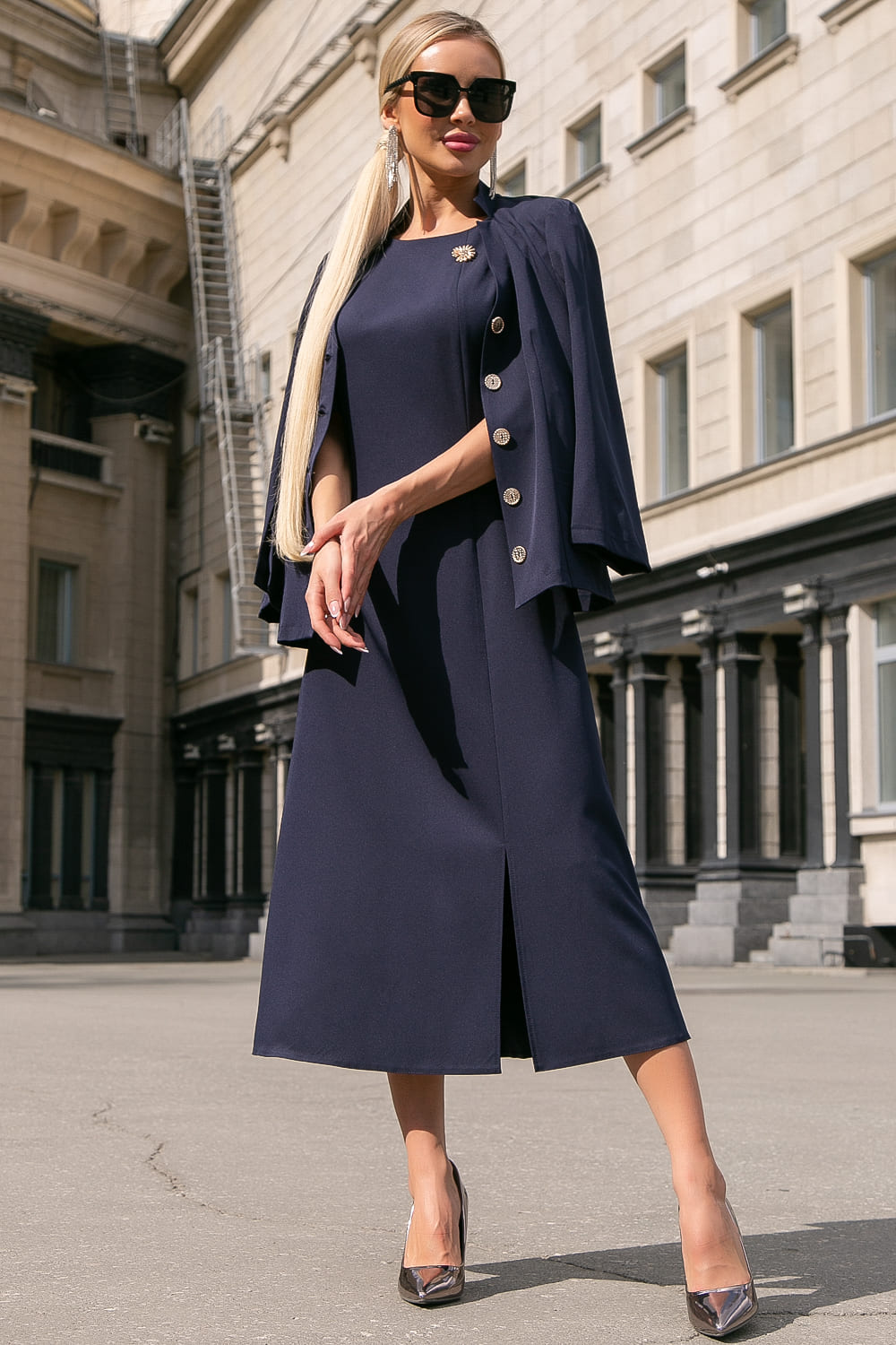 Элегантное платье длины миди станет украшением деловых образов. Стоит обратить внимание на его женственный и лаконичный дизайн, благодаря которому платье может легко стать украшением вечернего образа, достаточно лишь подобрать соответствующие аксессуары. Платье полуприлегающего кроя. Акцент на передней части платья - разрез по ножке. Рукав втачной, укороченный, кроя "колокольчик". По спинке застёгивается на потайную молнию. Платье без подкладки.