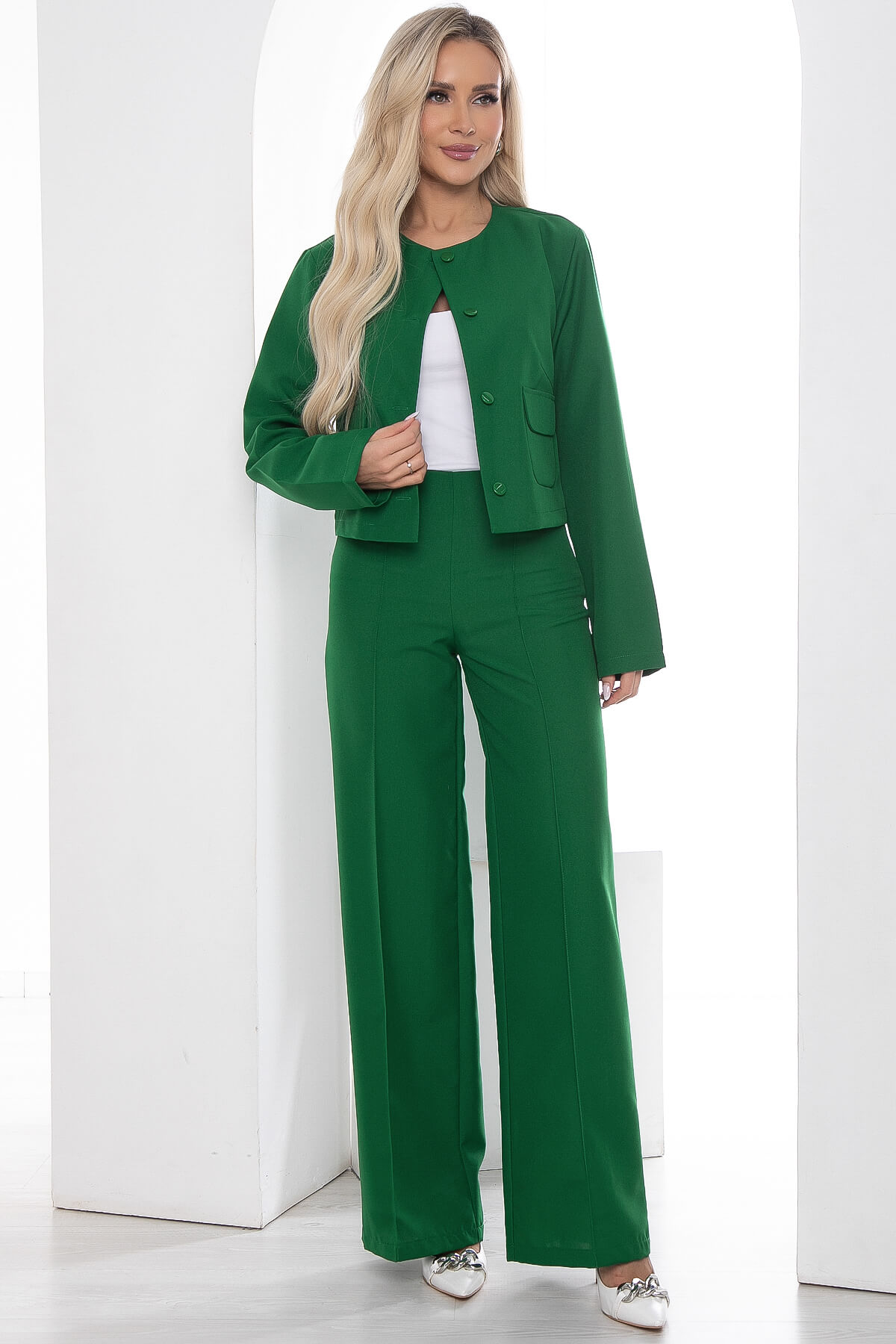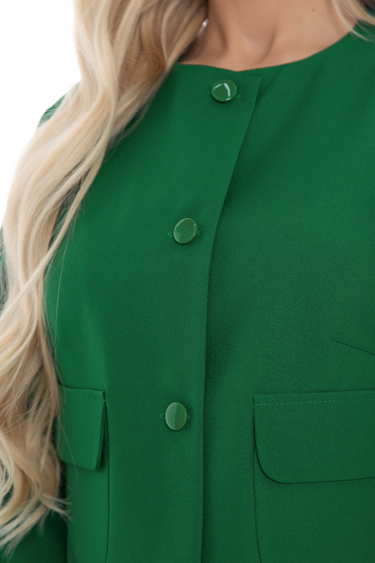 Укороченный жакет полуприлегающего силуэта, длинный втачной рукав, накладные карманы с клапанами, круглый вырез горловины, центральная застежка на петли/ пуговицы. Без подкладки.